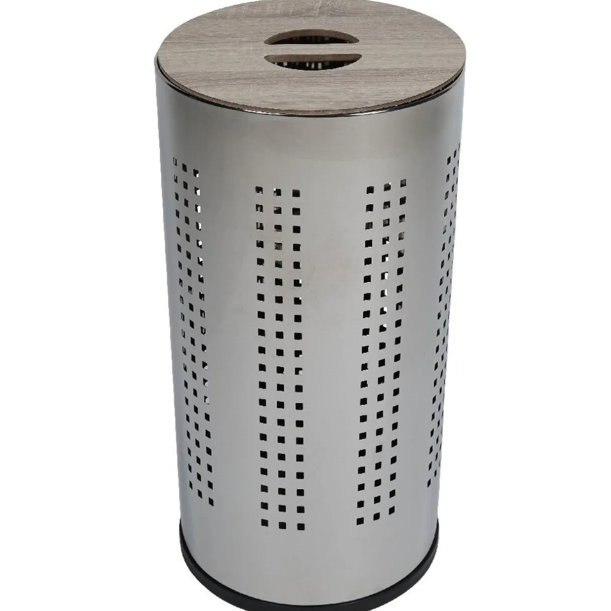 Faites de votre bac à linge un véritable accessoire déco ! On adore ce panier à linge cylindrique, en métal gris argenté avec couvercle en bois. Le socle est en plastique noir : antidérapant et évite les chocs et traces sur votre sol.