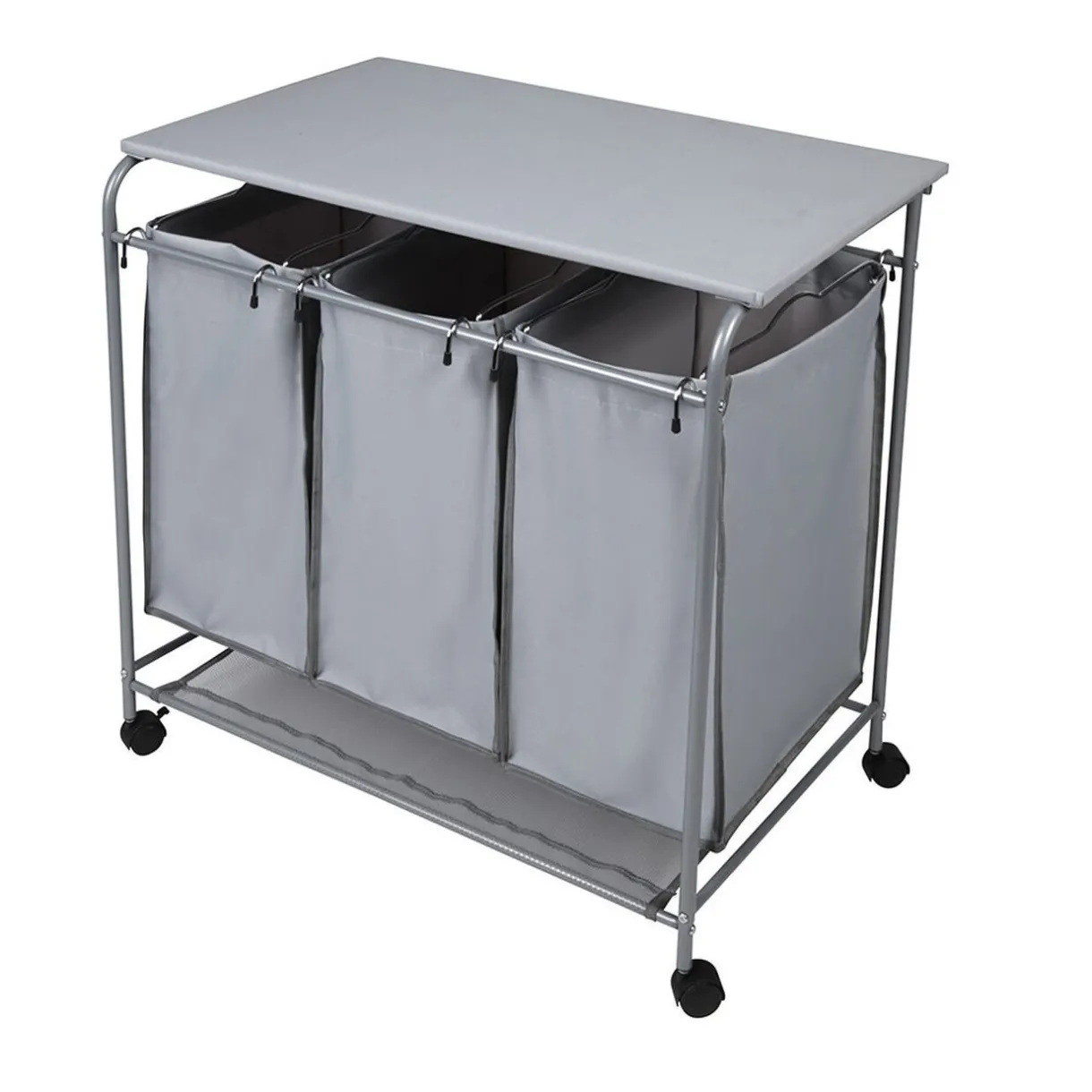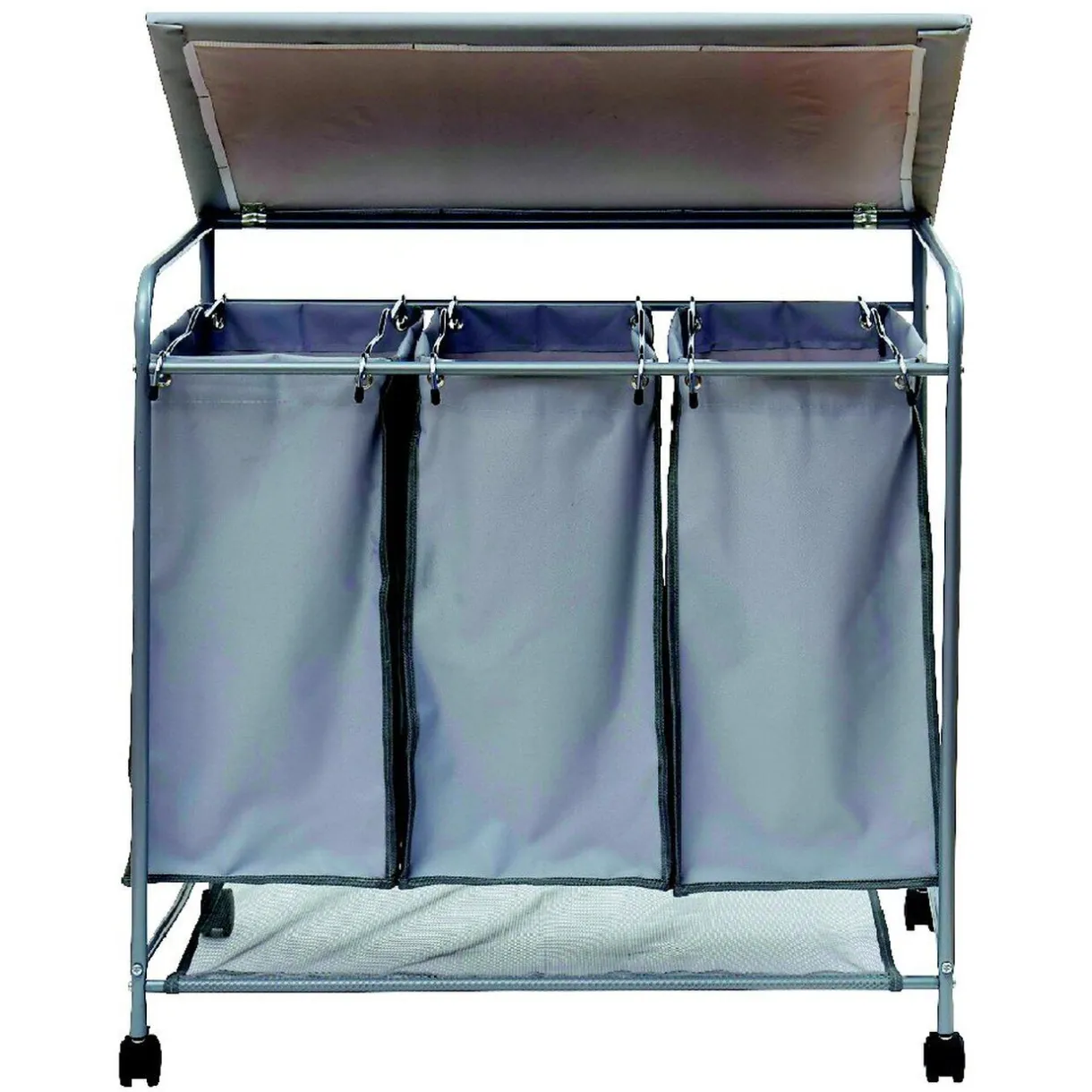 Chariot de buanderie 3 panières, dim. 75x45x77 cm, structure métal.Paniers amovibles, table d’appoint renforcée, roulettes multidirectionnelles.Facilite le tri du linge.