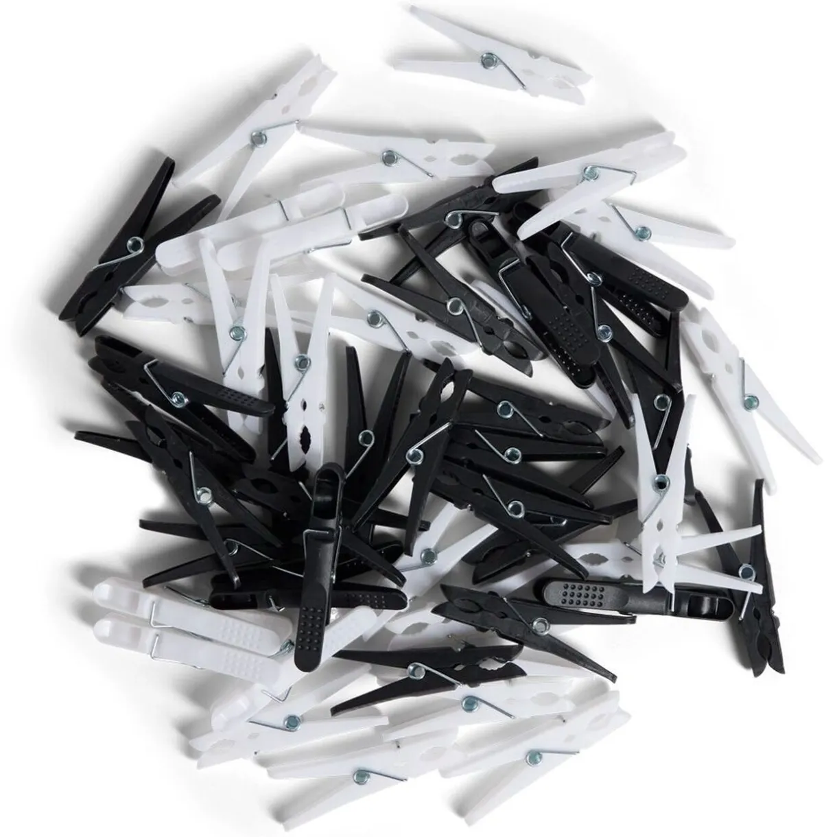 Ce panier en plastique blanc est une solution de rangement pratique pour les 50 pinces à linge tricolores qu’il contient.