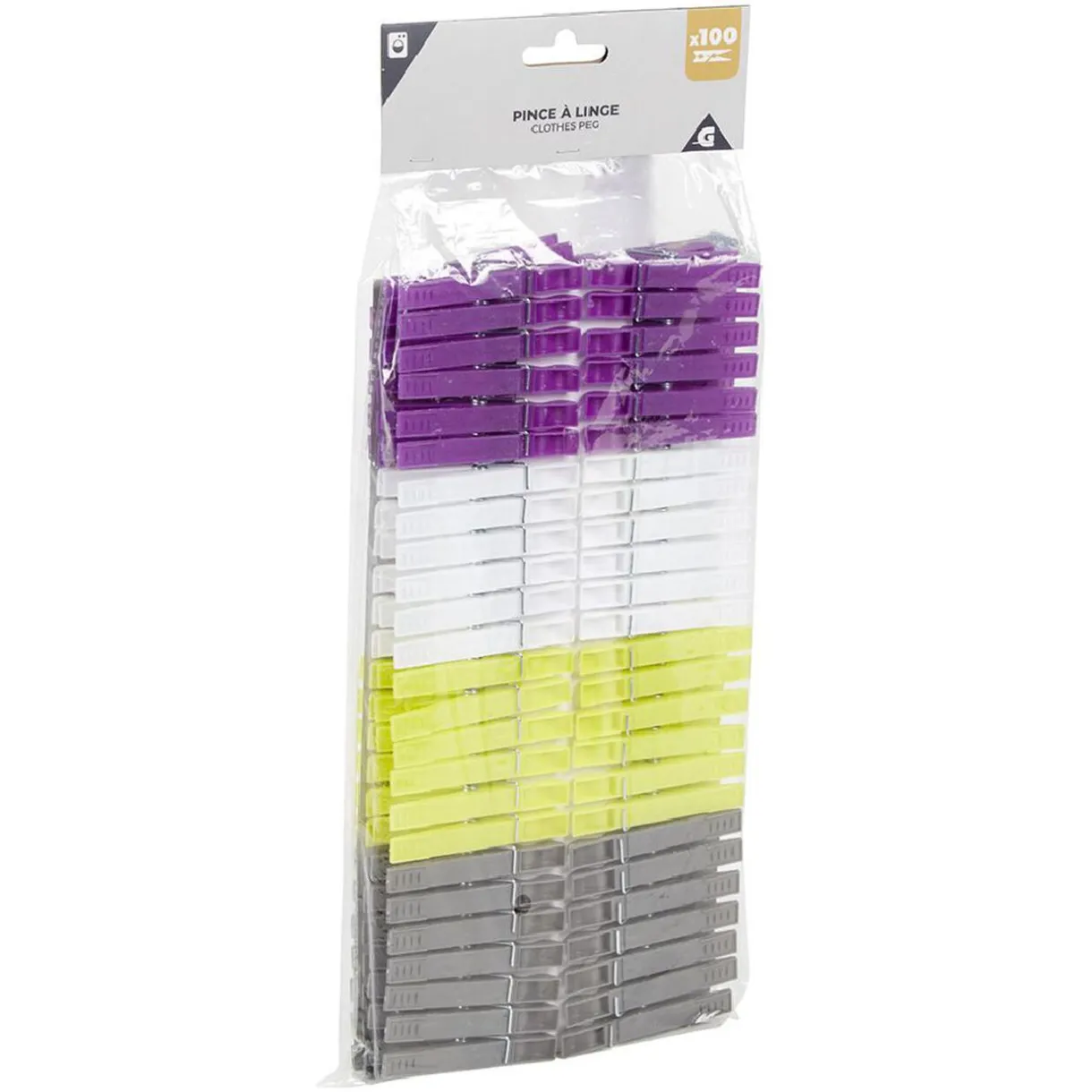 Le lot est composé de pinces de couleurs différentes : violet, blanc, jaune, gris.