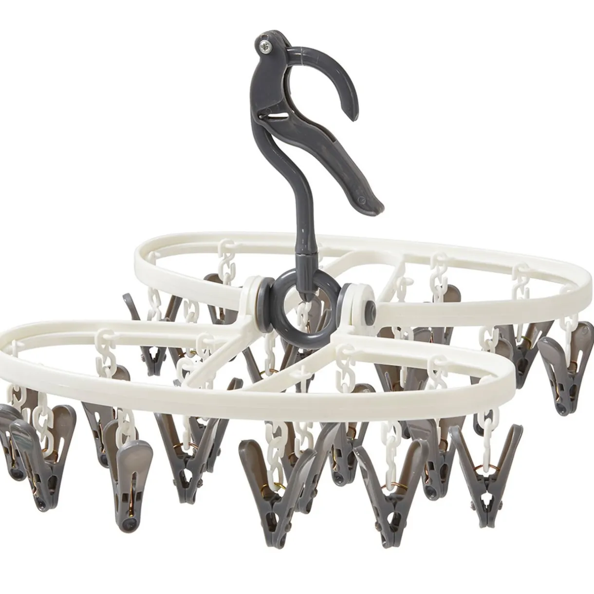 Séchoir à linge à suspendre composé de 24 pinces colorées.