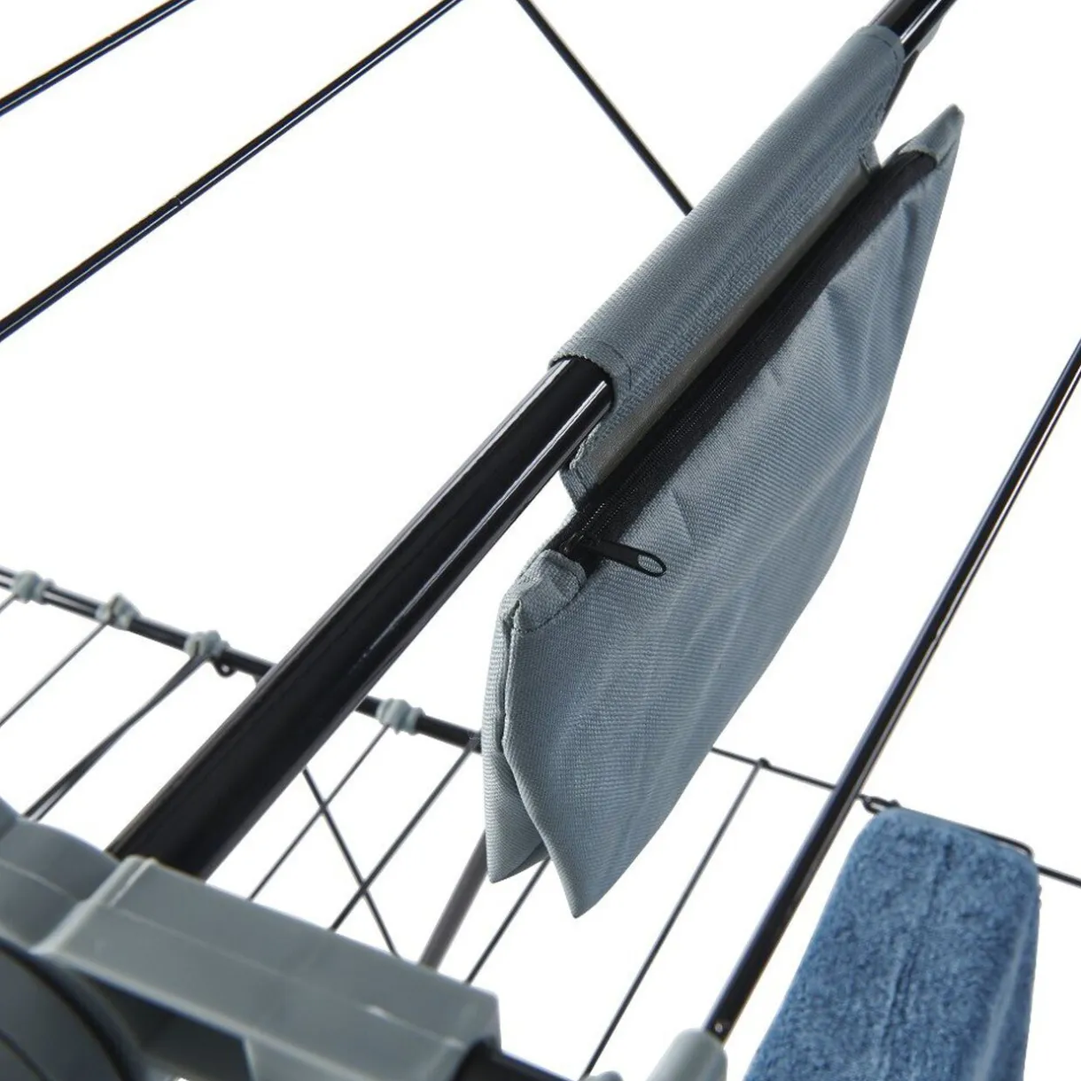 Équipé d’une petite trousse zippée au centre de l’étendoir, vous pourrez y stocker vos pinces à linge. De plus, vous trouverez un support plastique à l’extrémité de l’étendoir afin d’étendre plus facilement votre petit linge tels que chaussettes, sous-vêtements, etc.