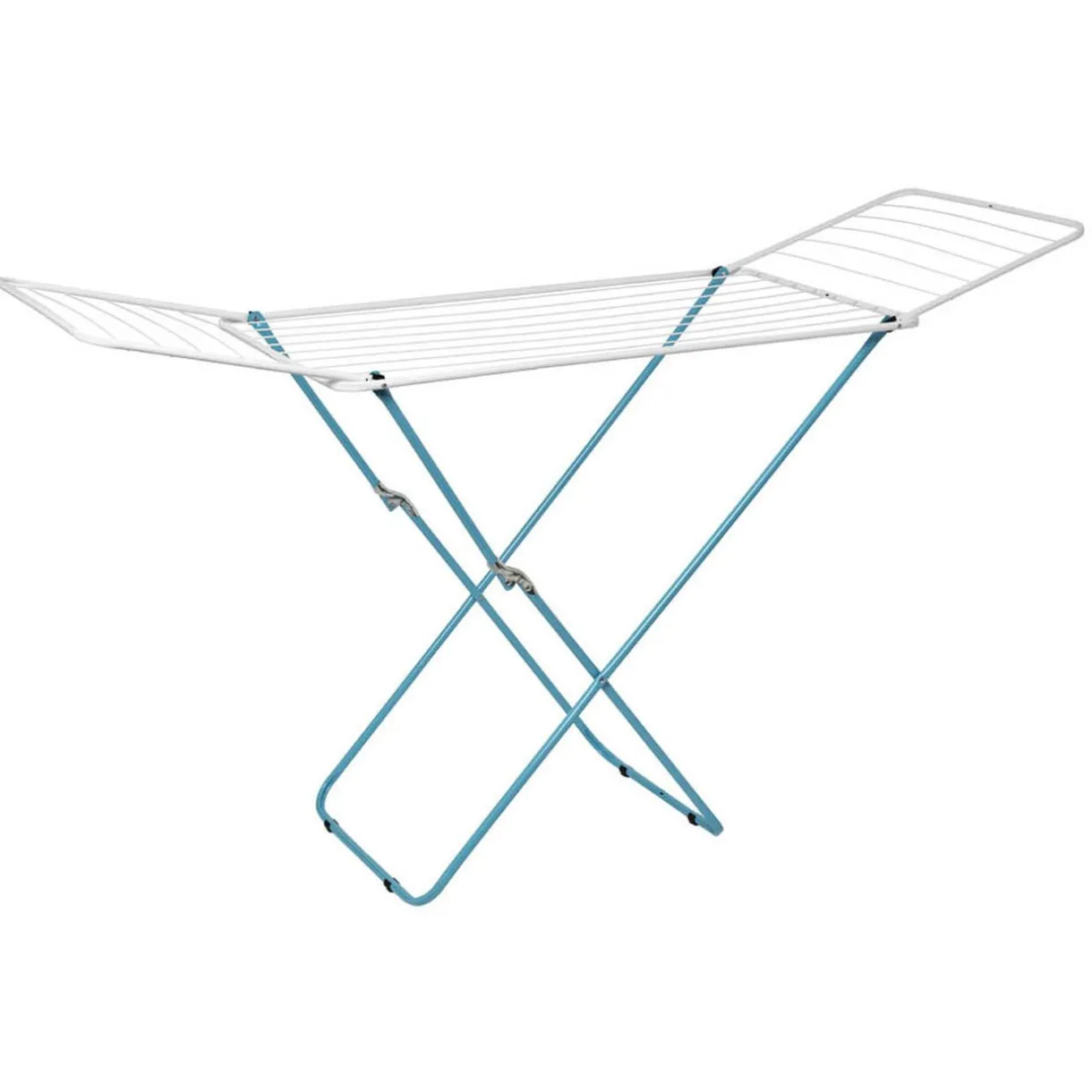 Séchoir à linge horizontal blanc et bleu avec une capacité de 18 mètres d’étendage. Facile à déplacer, il vous permettra de sécher votre linge à l’intérieur comme à l’extérieur ! !