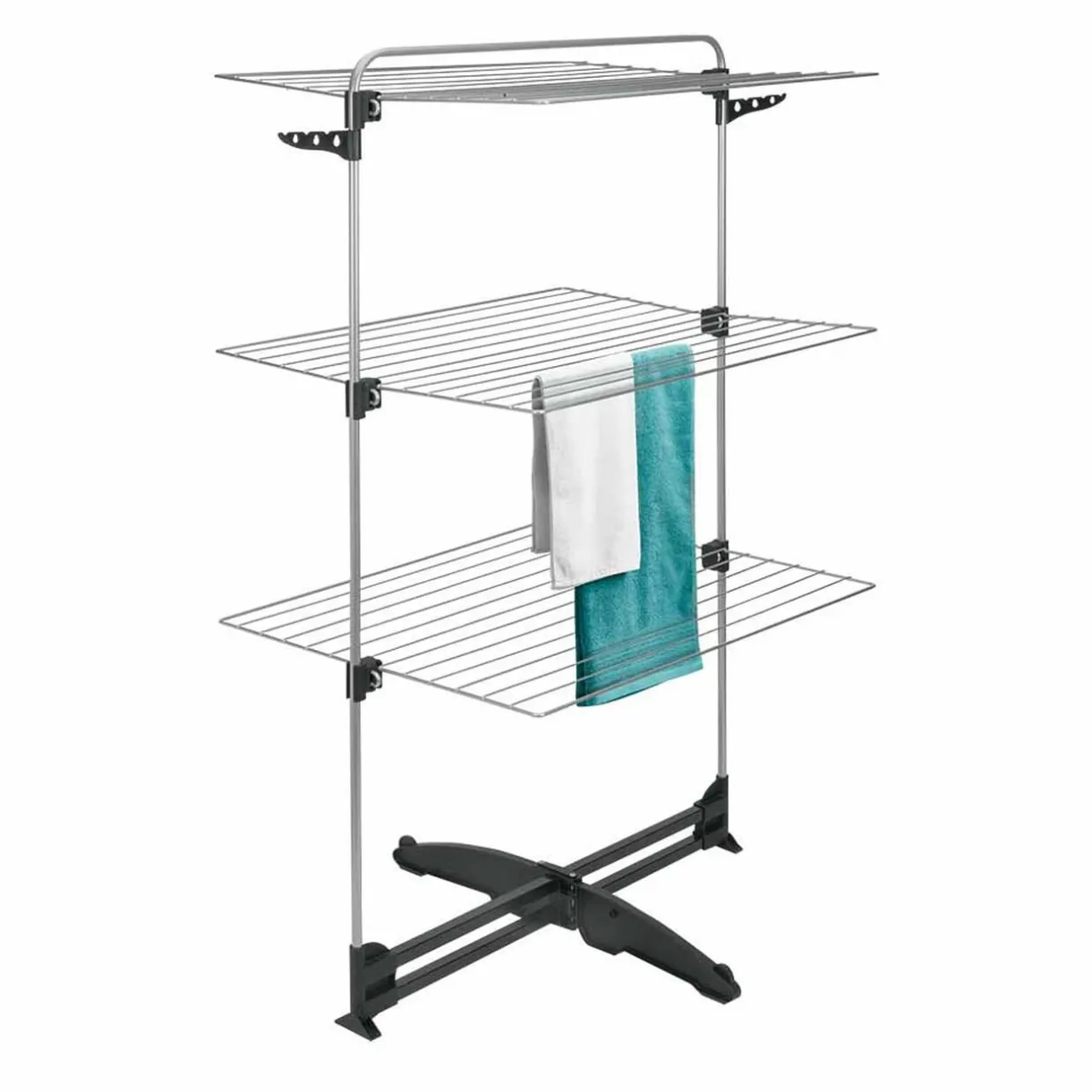 Séchoir tour sur 3 niveaux avec double porte-cintres et revêtement EPOTHERM, résistant et facile d’entretien.