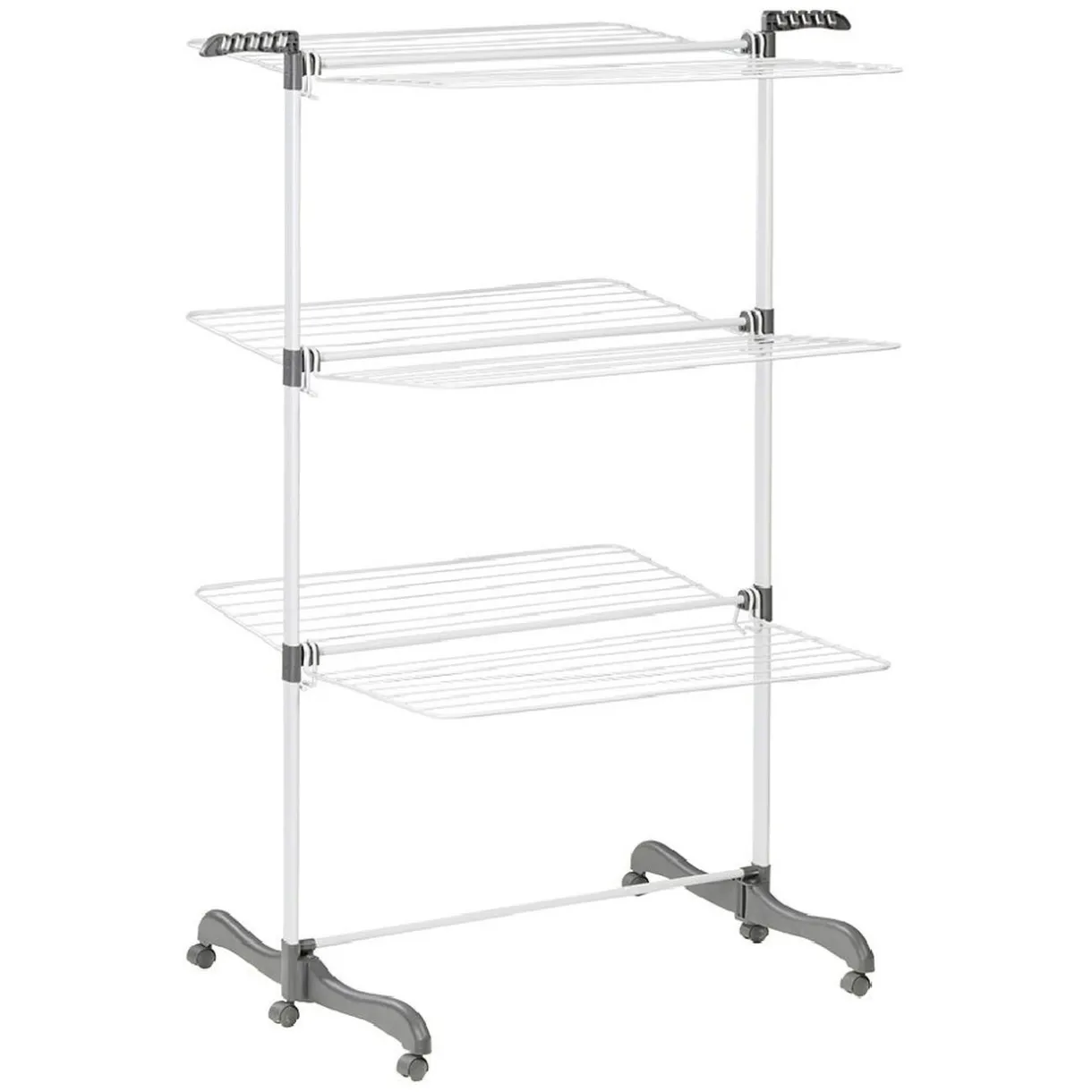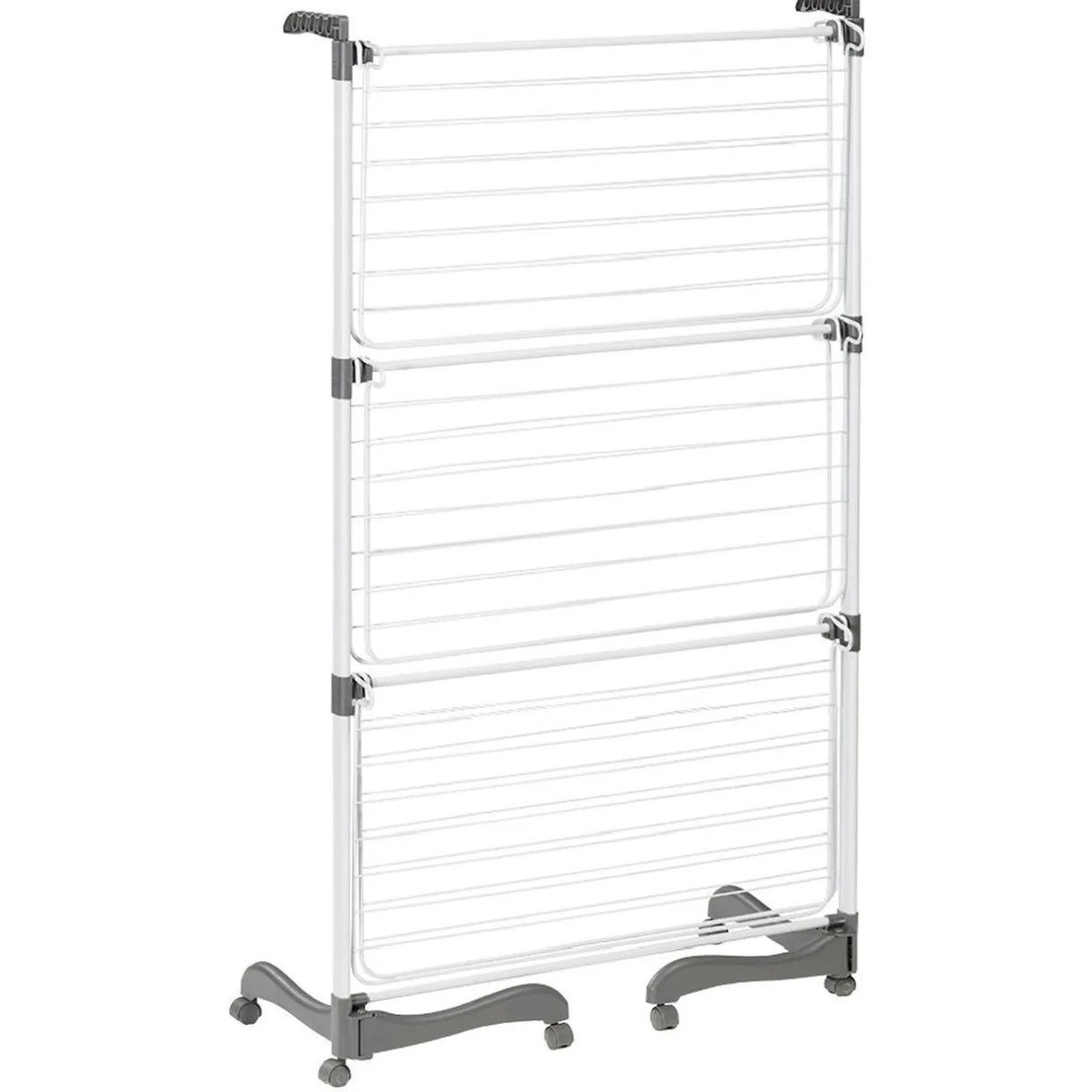 Séchoir tour sur 3 niveaux avec double porte-cintres et revêtement EPOTHERM, résistant et facile d’entretien.