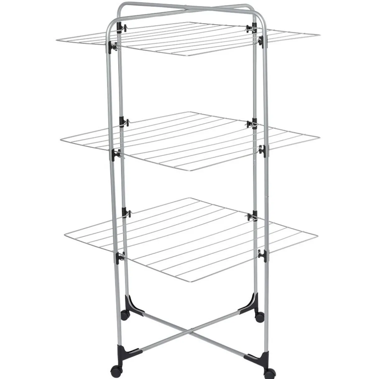 Ce séchoir à 3 niveaux en métal et plastique gris est pliable et livré avec des roulettes pour pouvoir le déplacer et le ranger aisément après chaque utilisation.