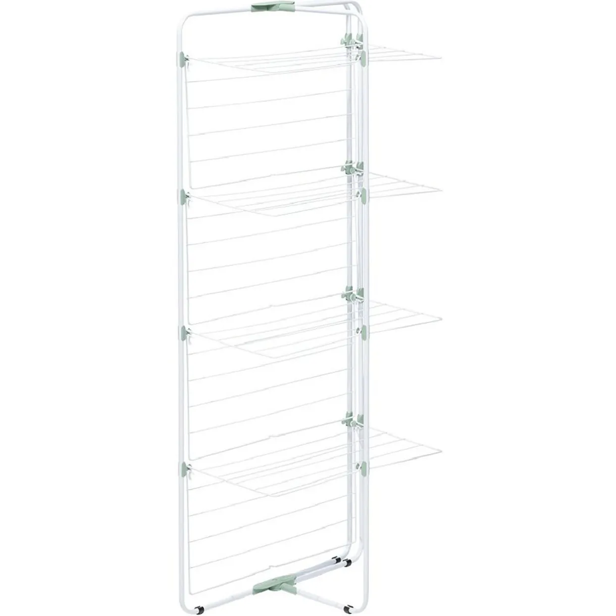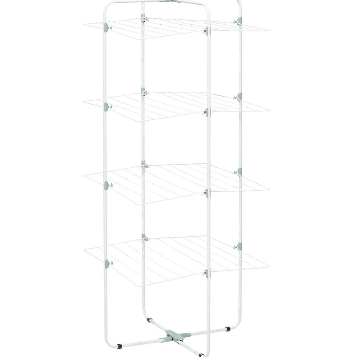 Séchoir tour à 4 niveaux avec structure résistante en acier et roulettes facilitant le déplacement.
