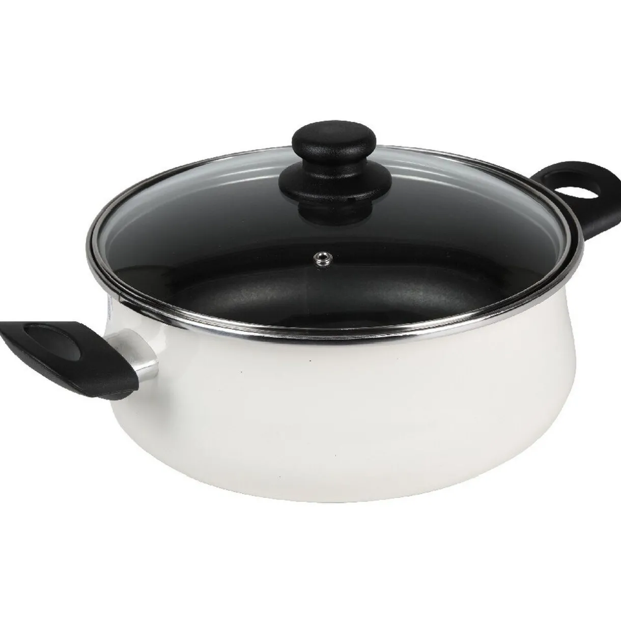 Faitout en acier émaillé anti-adhésif noir et beige de 26 cm de diamètre.