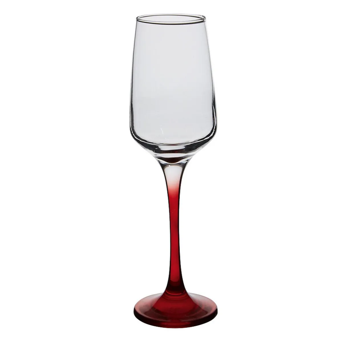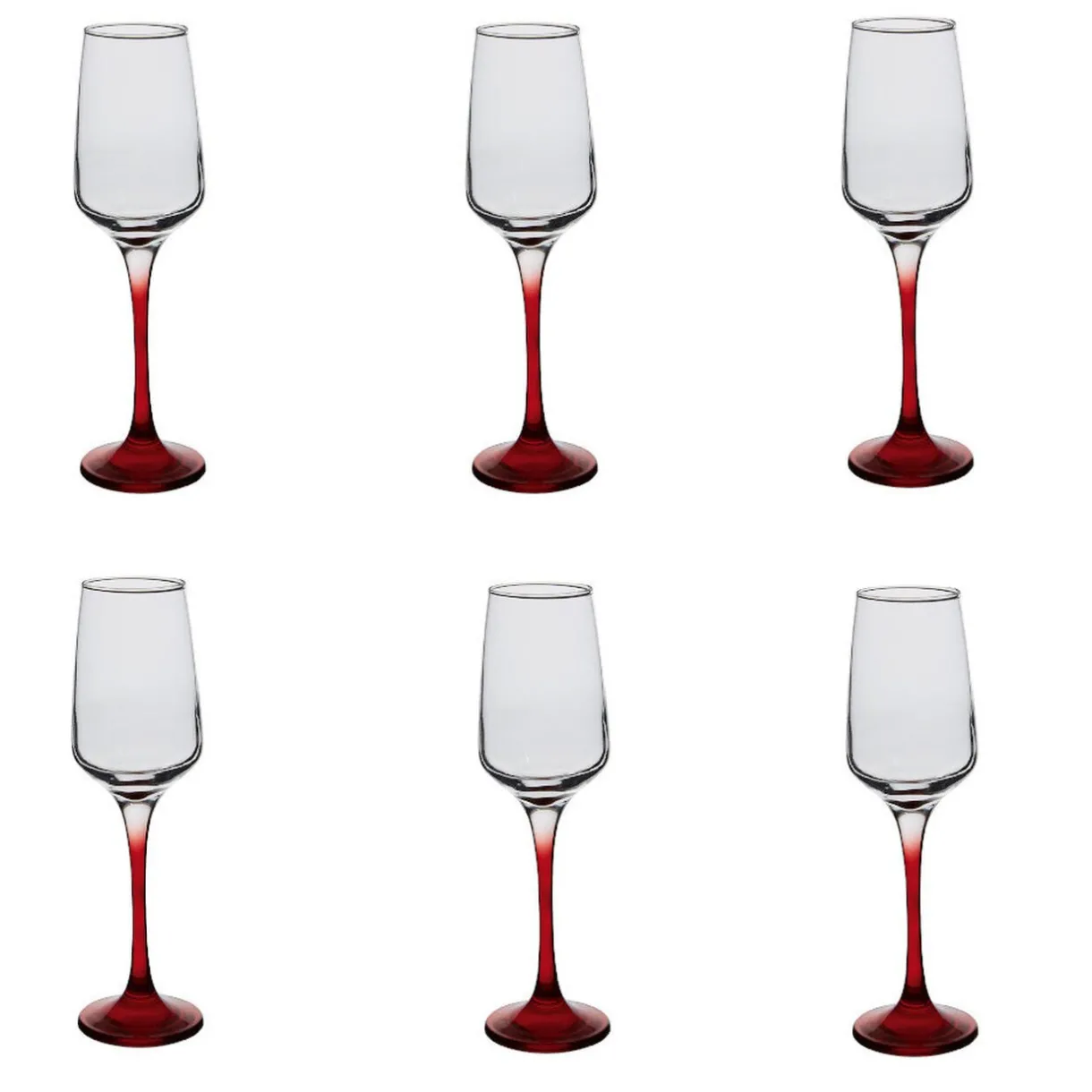 6 flûtes à champagne transparentes avec pied de couleur rouge translucide.