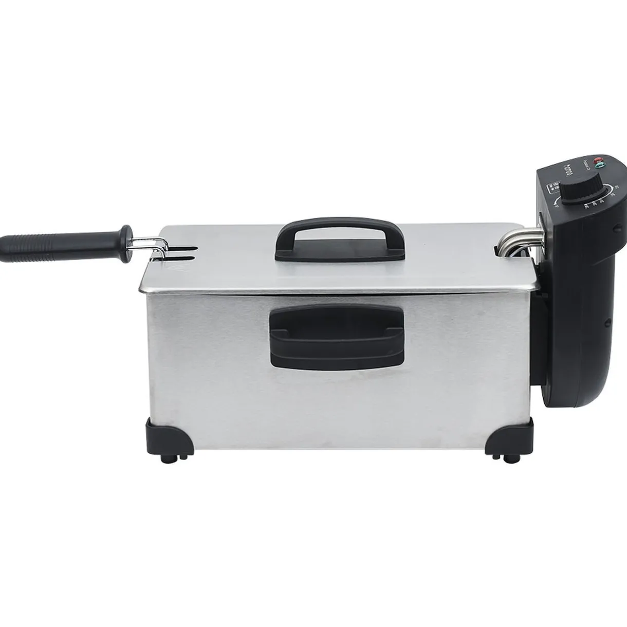 Friteuse Homday d’une contenance de 3 L, avec cuve amovible en inox et pieds antidérapants.