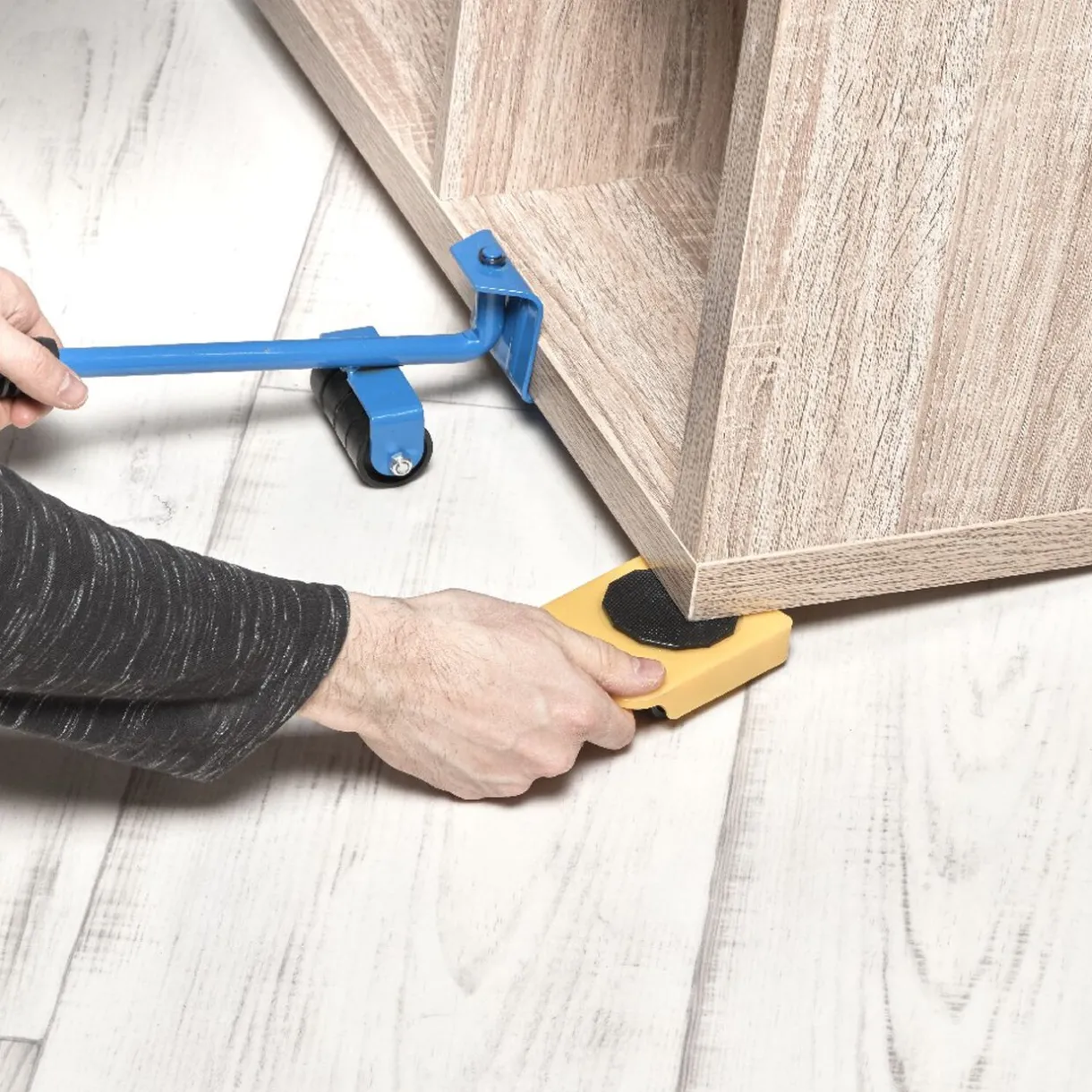 Ne vous embêtez plus ! Optez pour le kit de manutention avec 1 levier lève-meuble jusqu’à 70 Kg et 4 patins à roulettes jaunes supportant une charge maximum de 150 Kg.