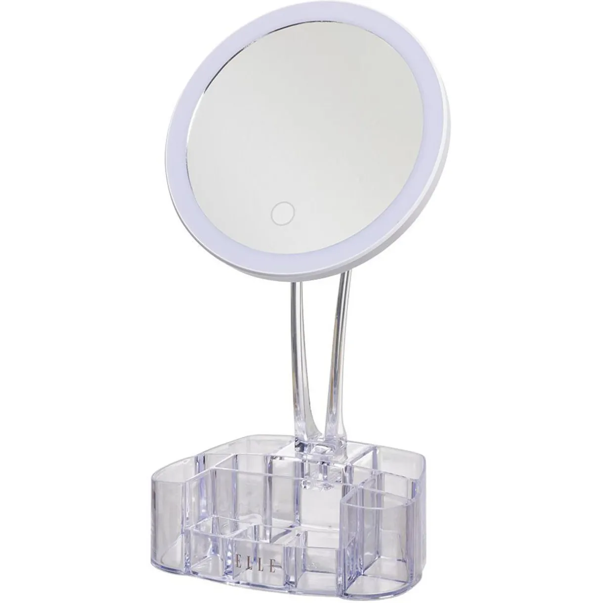 Miroir de table lumineux de forme ronde avec rangement transparent pour vos cosmétiques et accessoires. Idéal pour aménager un petit espace pour se maquiller et s’apprêter.