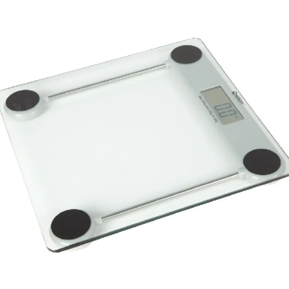 Poids maximal 150 kg, précision 100 g, pieds antidérapants, dim. 30×30 cm, verre, fonctionne avec 1 pile CR2032 fournie. Garantie 2 ans.