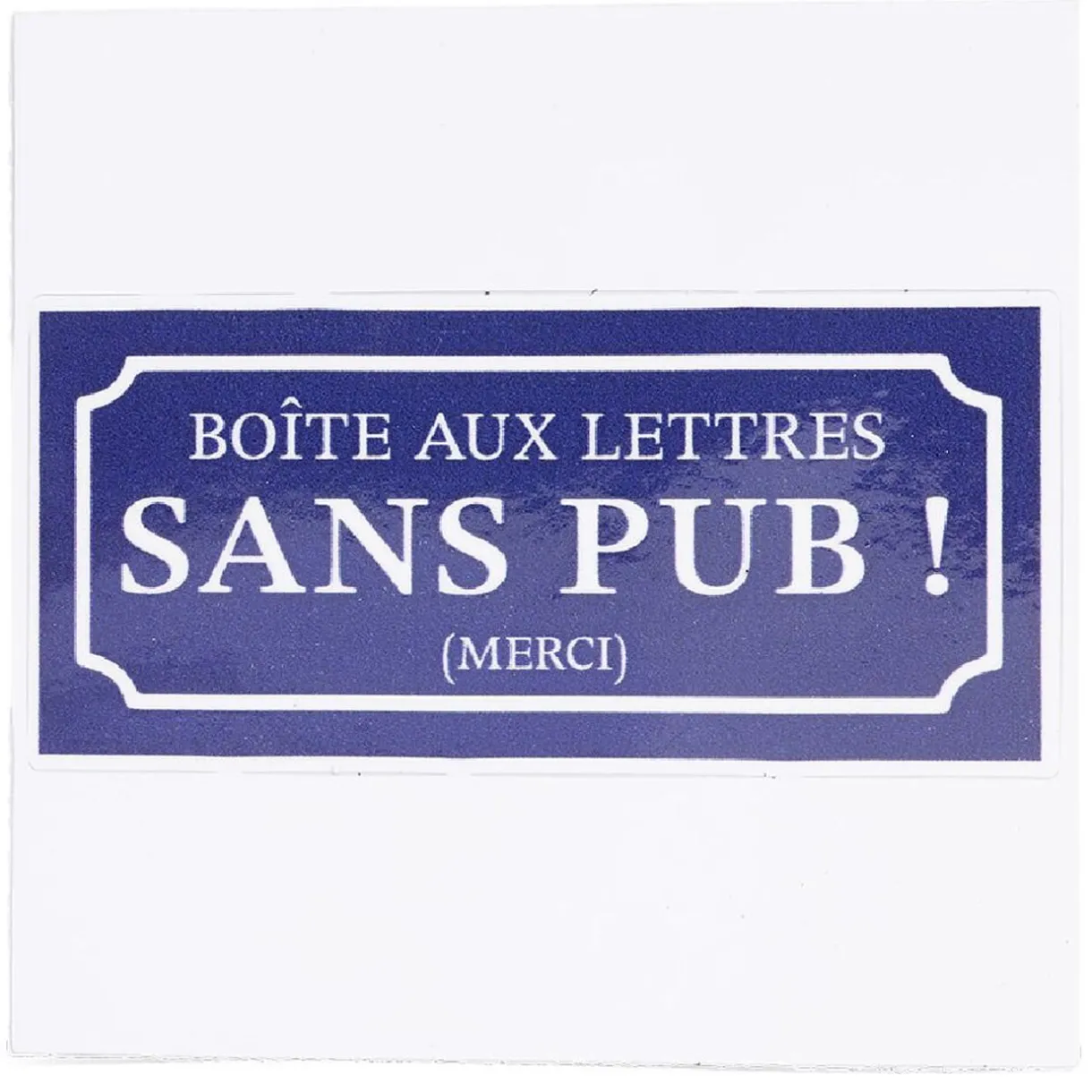 Signalétique adhésive avec texte sur fond bleu indiquant « Boîte aux lettres SANS PUB ! MERCI « .