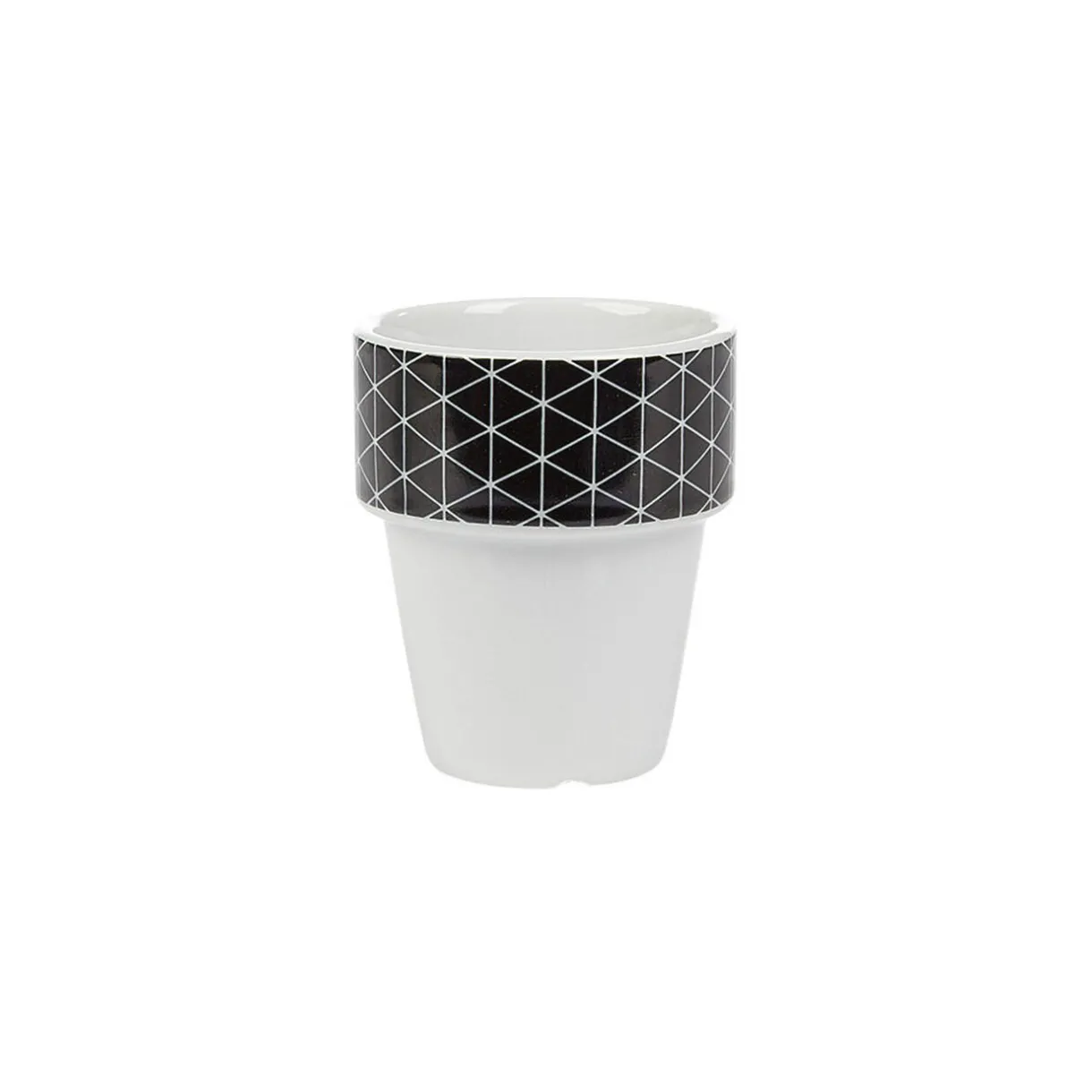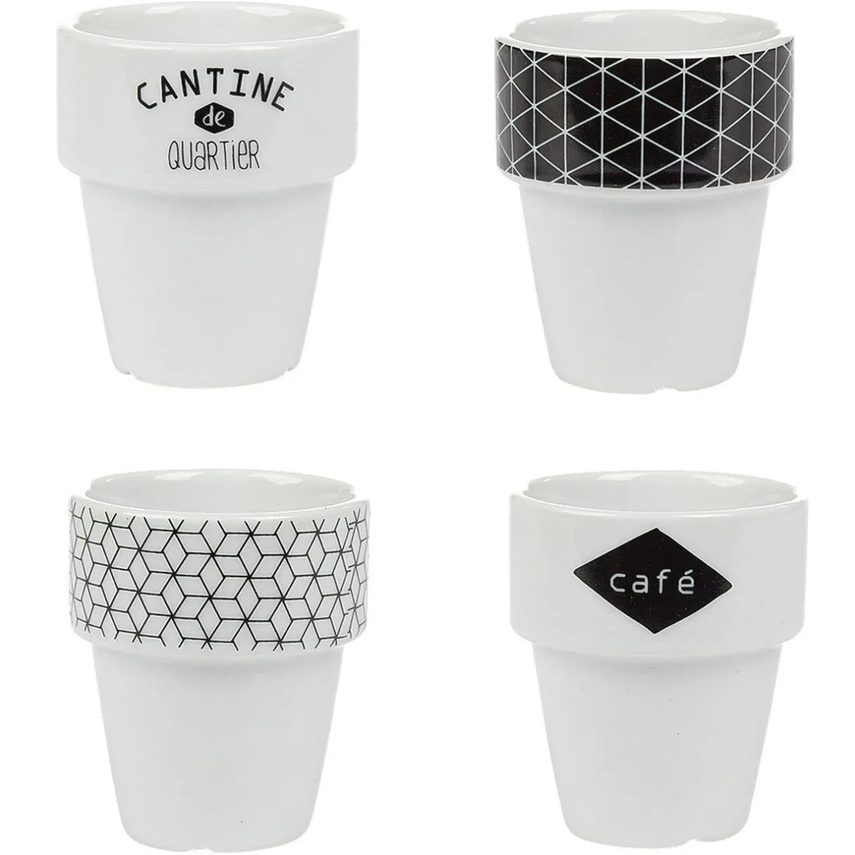 Set de 4 mugs en porcelaine assortis noirs et blancs: 2 mugs avec motif graphique et 2 avec inscription design Café et Cantine de quartier. Idéal pour apporter une chic et moderne à vos pauses cafés!