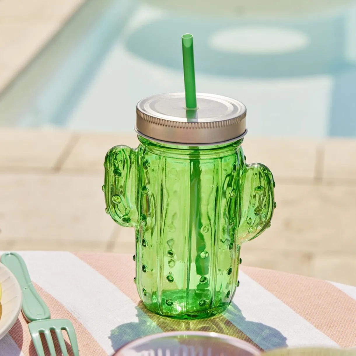 Gobelet en verre en forme de cactus vert ou de fraise rose avec couvercle en métal et paille assortie, idéal pour savourer son cocktail en été.