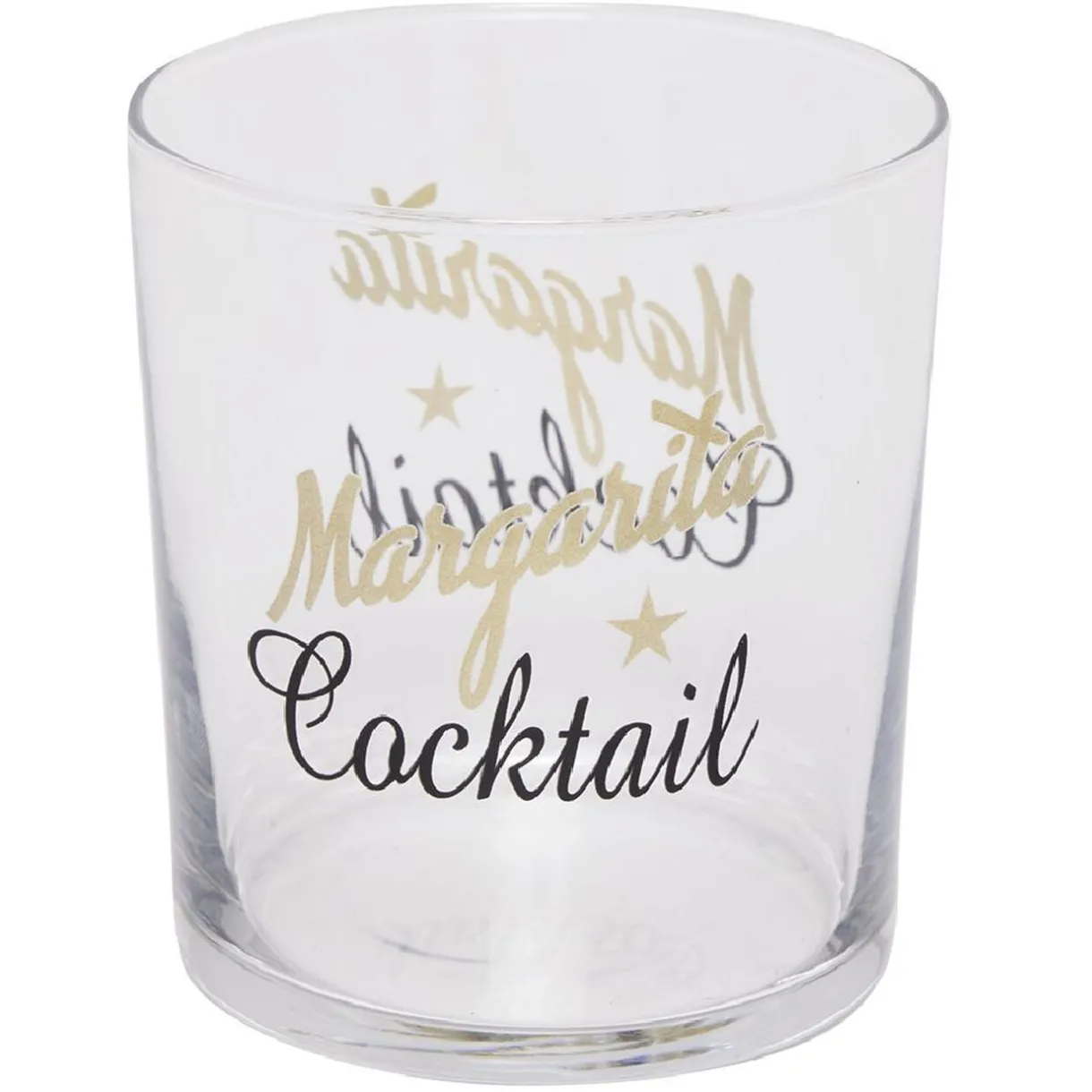 Lot de 3 gobelets en verre transparent avec inscription noire et dorée.
