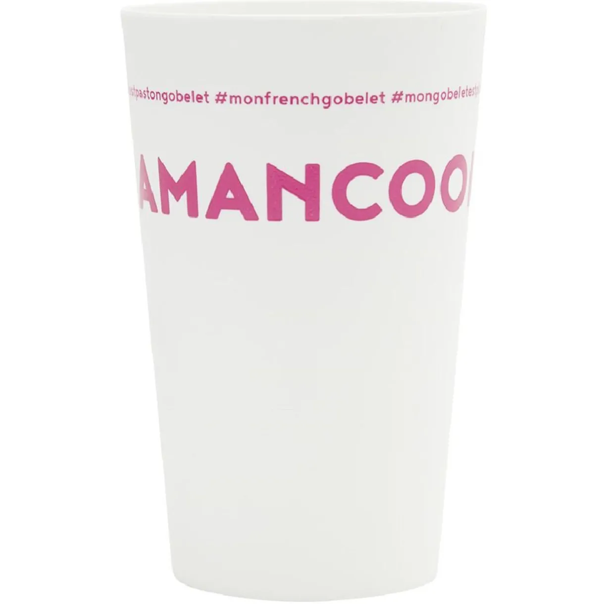 Gobelet réutilisable en plastique blanc avec inscription rose #MAMANCOOL.