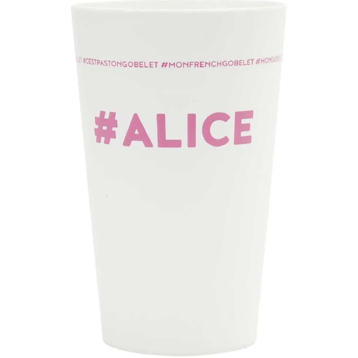 Gobelet réutilisable en plastique blanc avec inscription rose #ALICE.