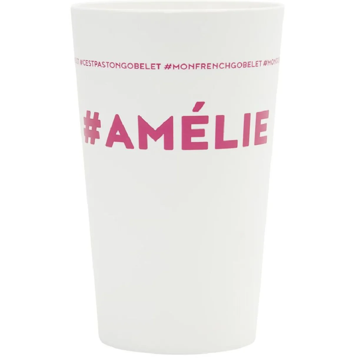 Gobelet réutilisable en plastique blanc avec inscription rose #AMÉLIE.