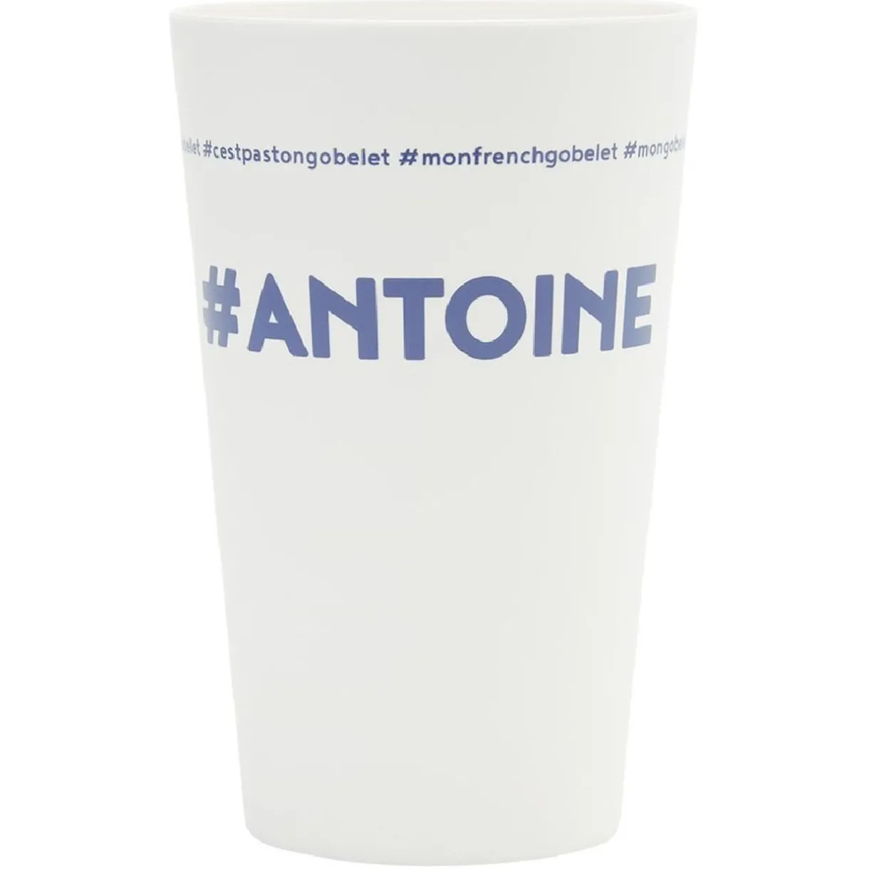 Gobelet réutilisable en plastique blanc avec inscription bleue #ANTOINE.