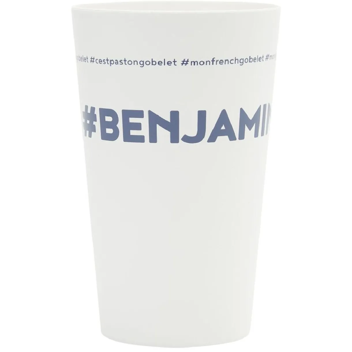 Gobelet réutilisable en plastique blanc avec inscription bleue #BENJAMIN.