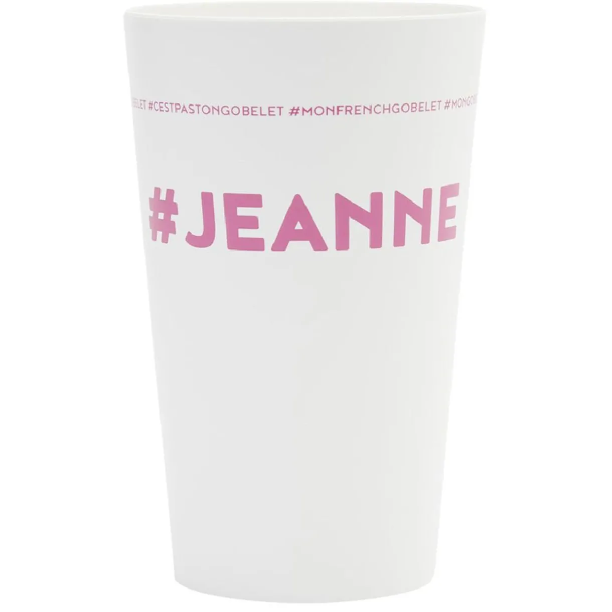 Gobelet réutilisable en plastique blanc avec inscription rose #JEANNE.
