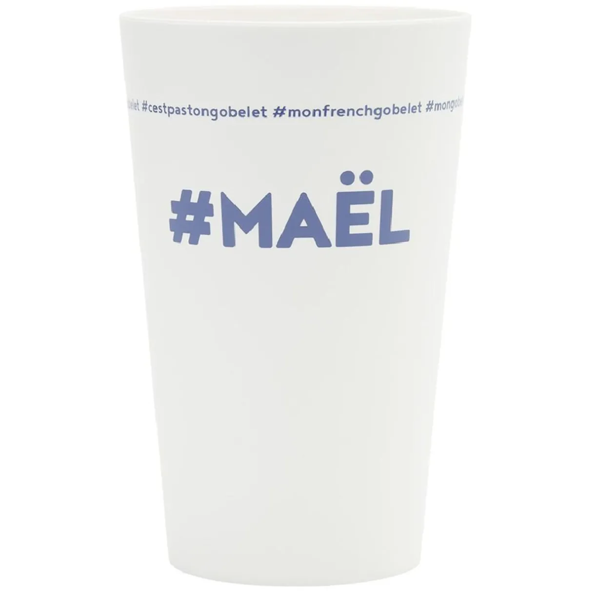 Gobelet réutilisable en plastique blanc avec inscription bleu #MAËL.
