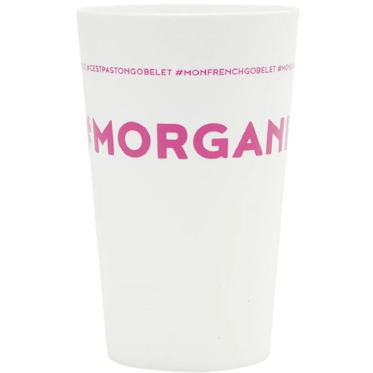 Gobelet réutilisable en plastique blanc avec inscription rose #MORGANE.