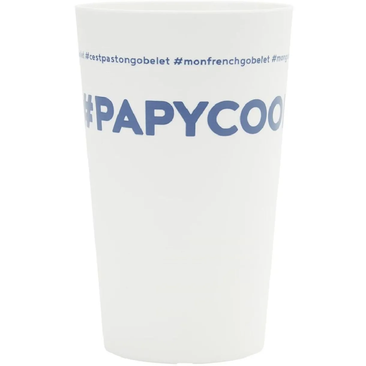 Gobelet réutilisable en plastique blanc avec inscription bleue #PAPYCOOL.