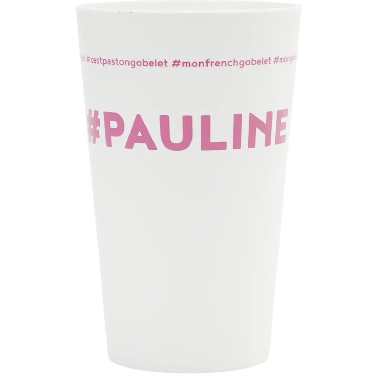 Gobelet réutilisable en plastique blanc avec inscription rose #PAULINE.