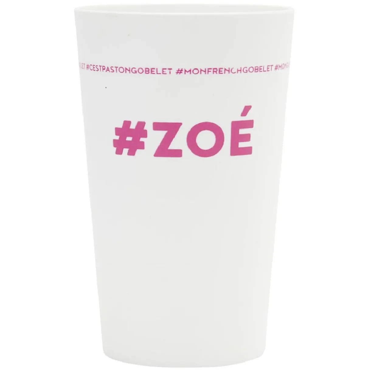 Gobelet réutilisable en plastique blanc avec inscription bleue #ZOÉ.