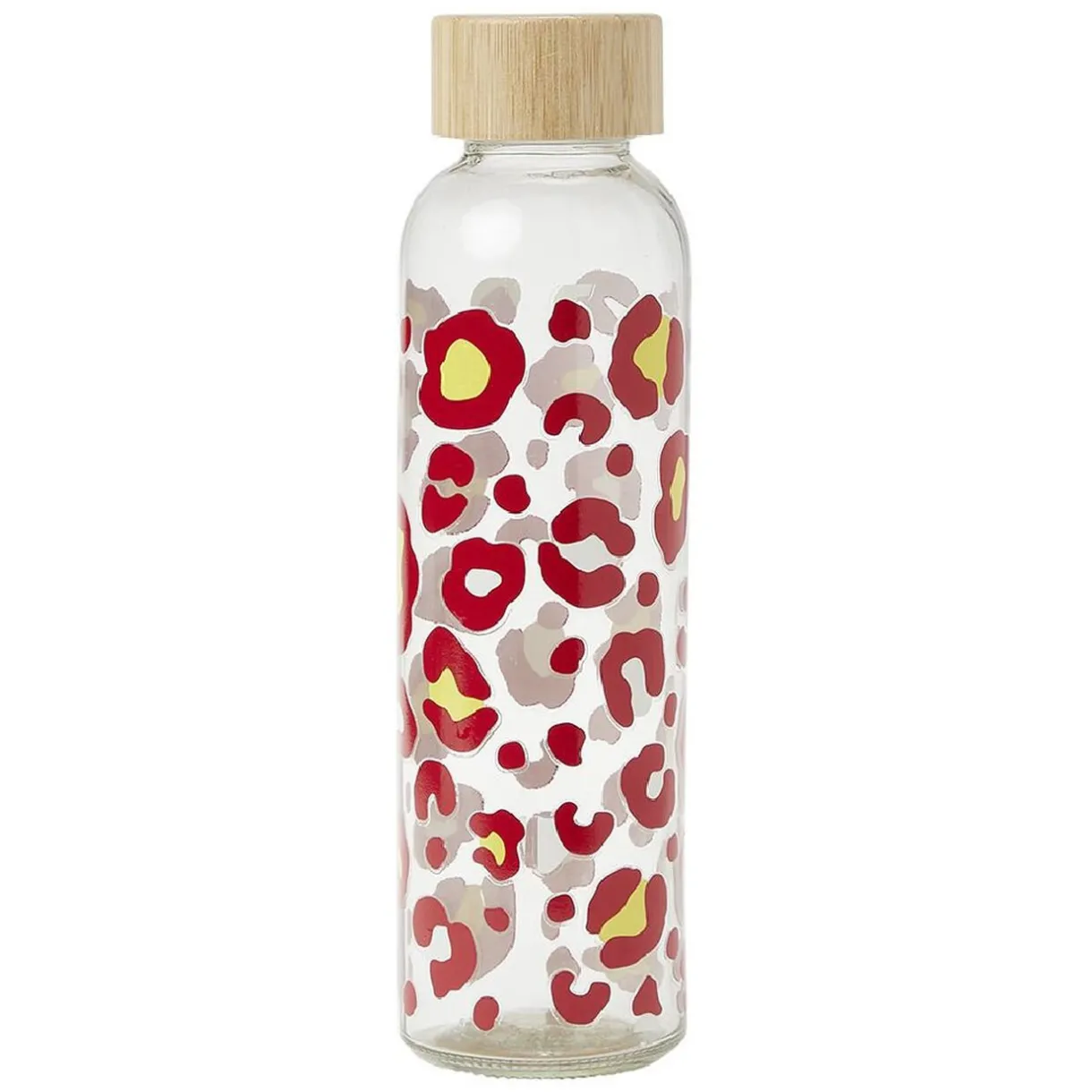 Remplissez de votre boisson préférée cette bouteille en verre à motifs avec bouchon en bambou.