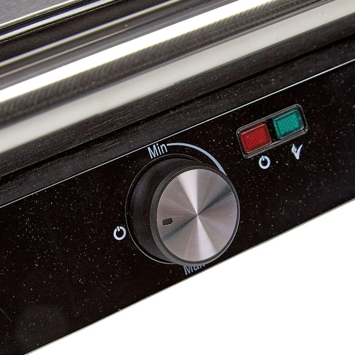 Idéal pour les viandes, les paninis et les légumes grillés, le grill dispose d’une température ajusqtable jusqu’à 230°C grâce au thermostat. il dispose également d’une ouverture à 180° pour une fonction plancha.
