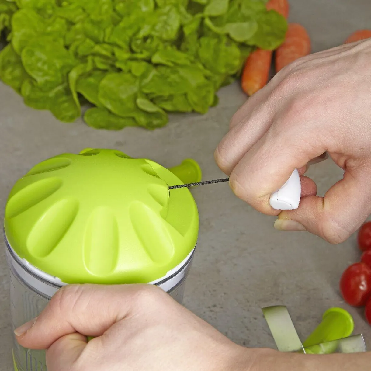 En actionnant sa cordelette les lames accélèrent pour couper, hacher et émincer tous type d’aliments.
