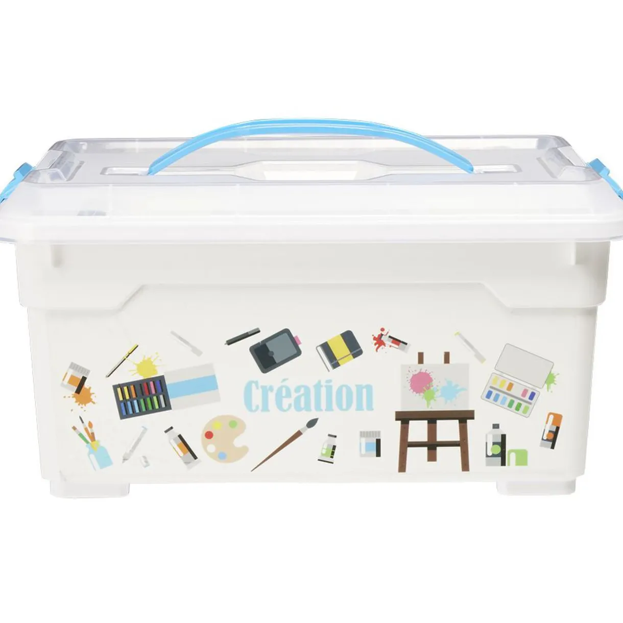 Boîte de rangement blanche en plastique imprimé accessoires de peinture et dessin, indispensable pour garder soigneusement rangés vos fournitures de loisirs créatifs.