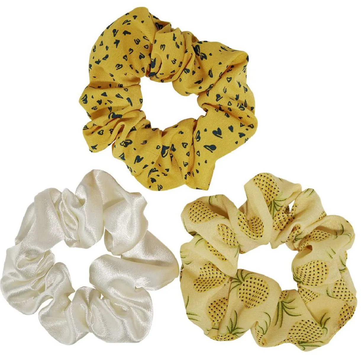 Lot de 3 chouchous dont un couleur ivoire effet satiné, un jaune motifs ananas et un moutarde motifs coeurs, le lot idéal pour varier les fantaisies dans vos coiffures !