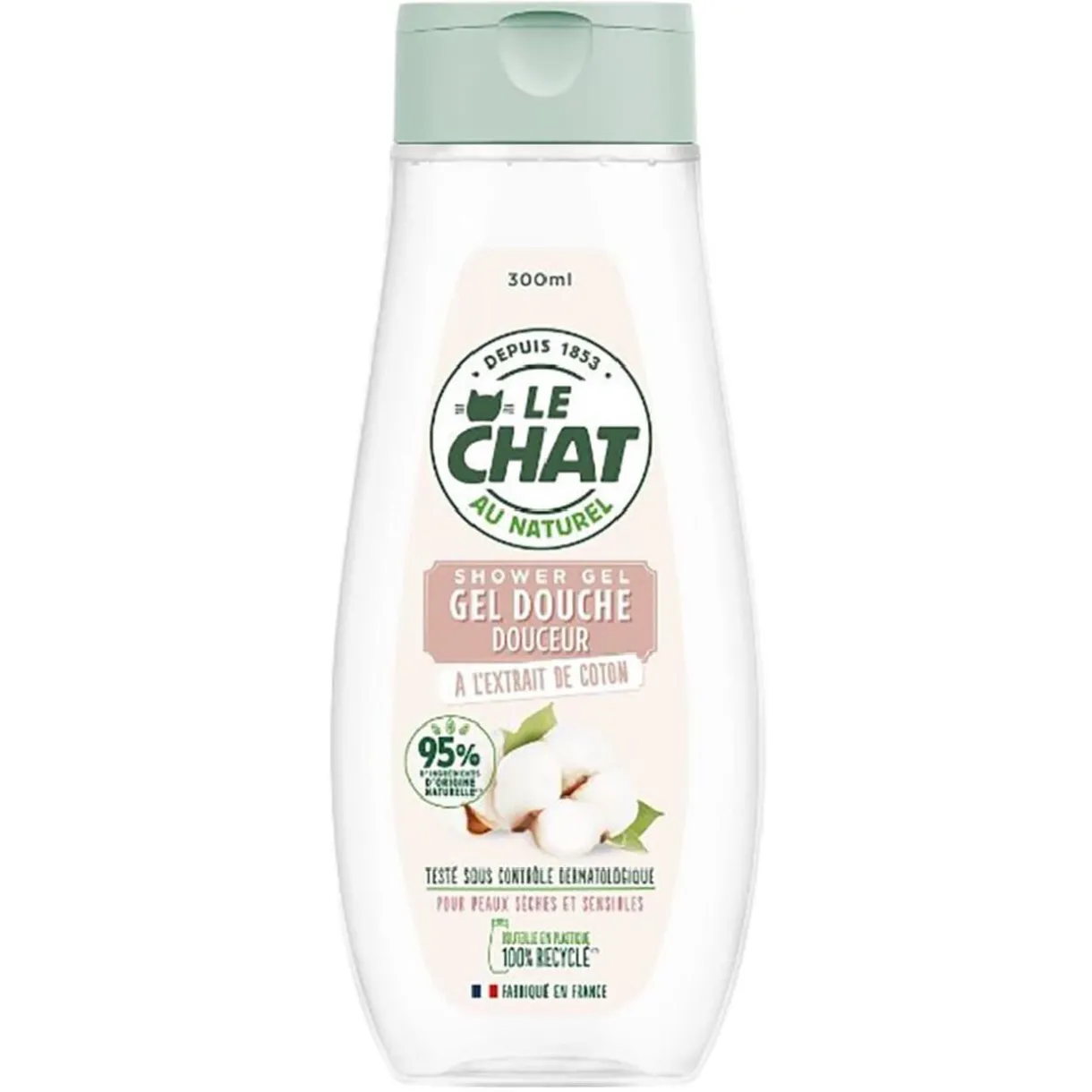 Idéal pour les peaux sèches et sensibles, le gel douche Le Chat Naturel à l’extrait de coton nettoie en douceur votre peau tout en préservant son film hydrolipidique.
