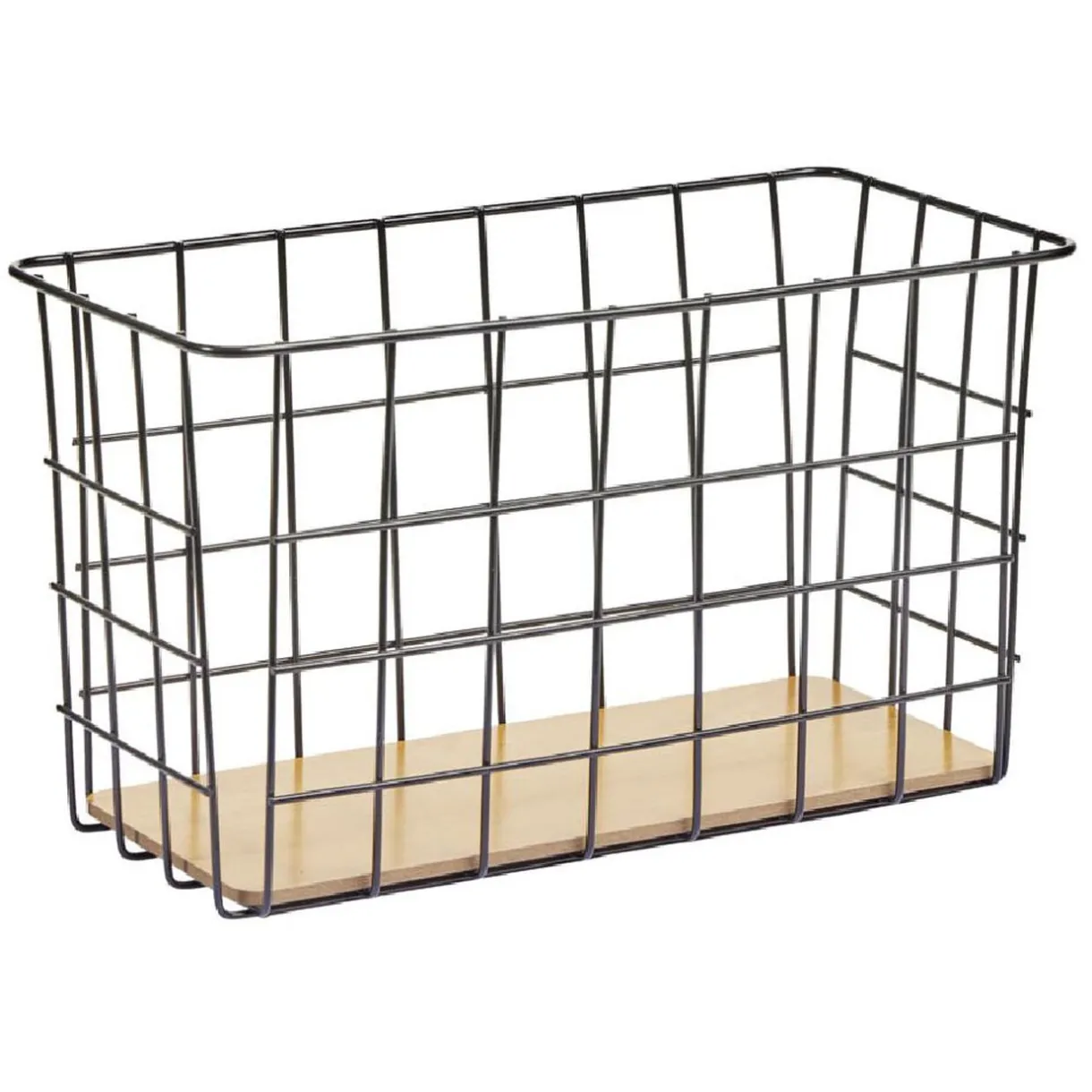 Panière en acier ajouré noir avec fond en bois, idéale pour optimiser le rangement de votre pièce que ce soit votre salon, votre salle de bain ou votre chambre.