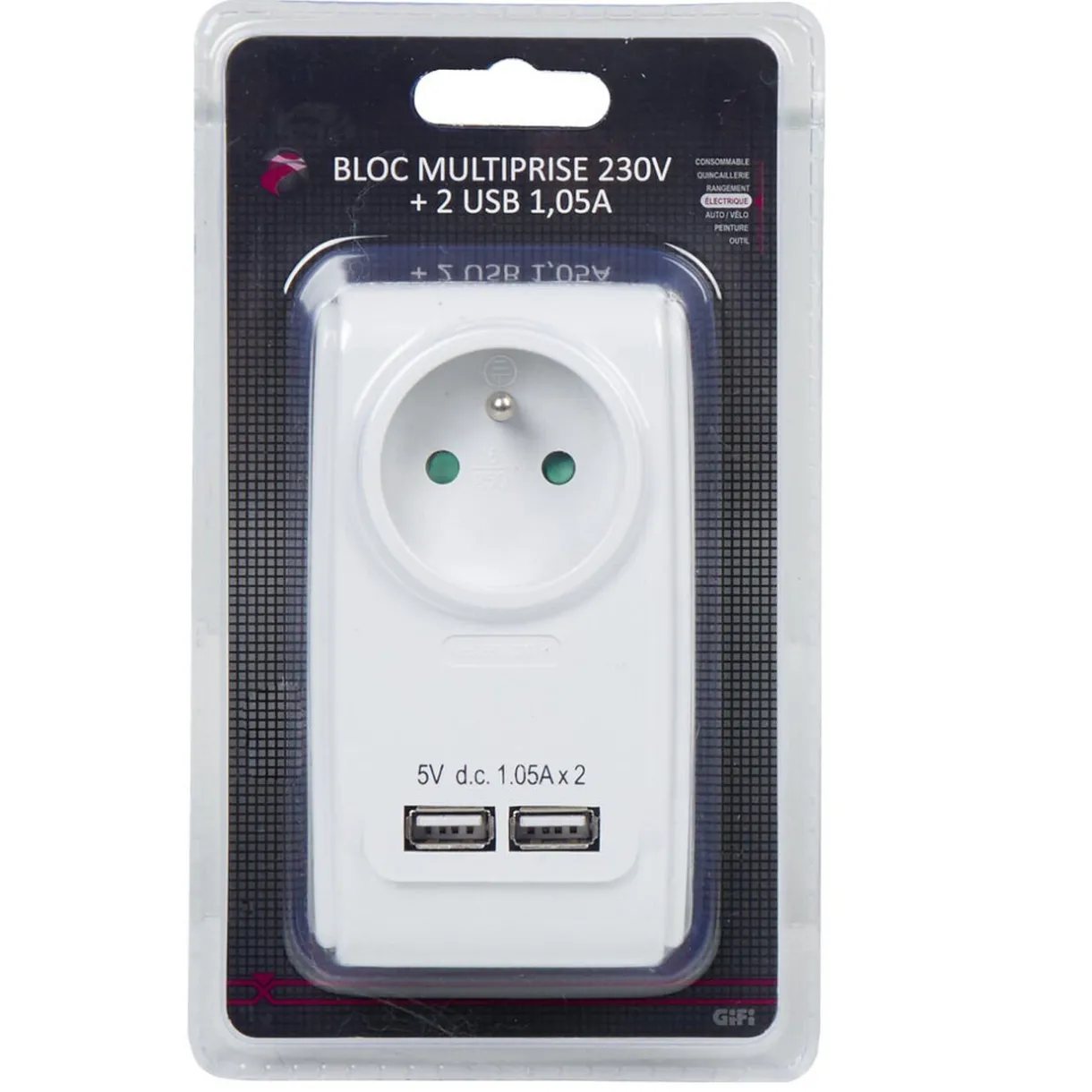 Prise chargeur 1x 230V et 2 ports USB, dim. 20x15x8 cm, polypropylène..