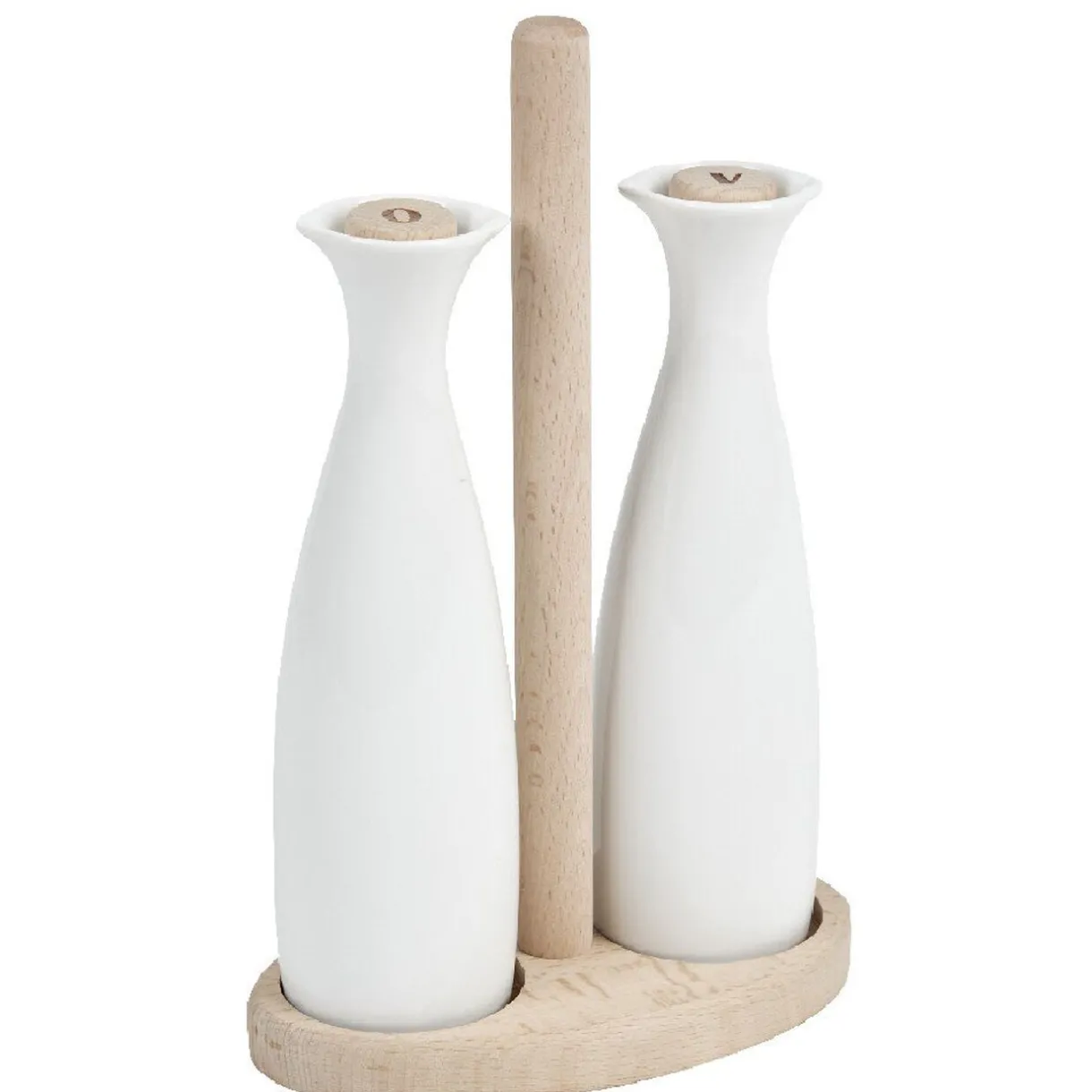 Lot huilier et vinaigrier en céramique support bois. Dimension 27 x 18 x 11 cm.