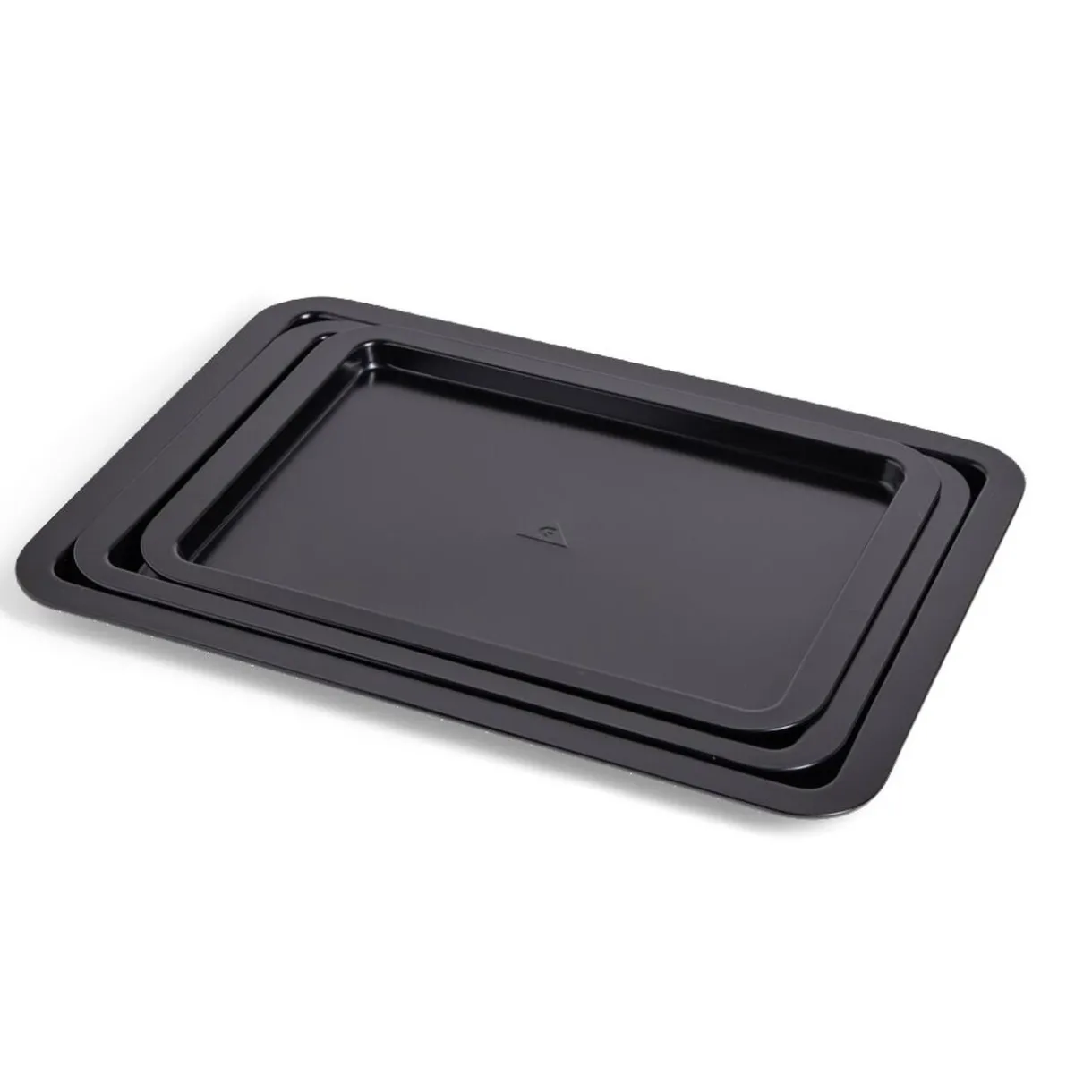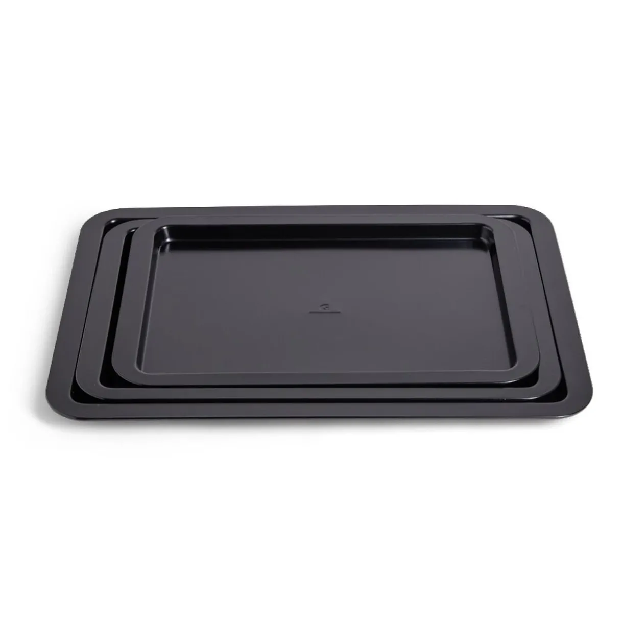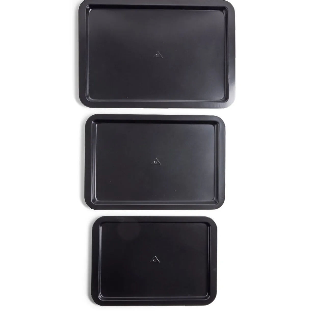 Lot de 3 plaques à four en métal noir de tailles variées : 38×29 cm, 43×29 cm et 48×29 cm.