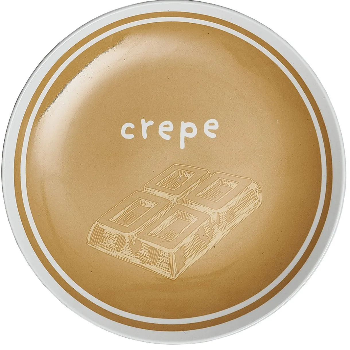 Lot de 4 assiettes rondes en faïence design crêpes avec petits motifs imprimés pour de délicieux goûters sucrés.