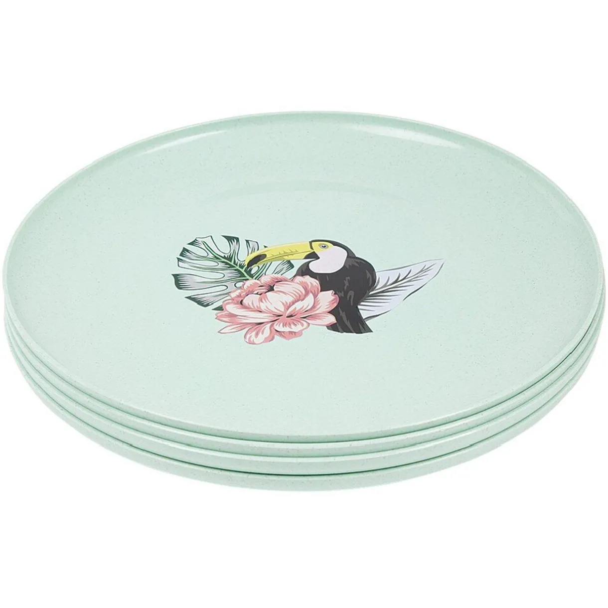 Lot de 4 assiettes plates au décor oiseau et feuille.