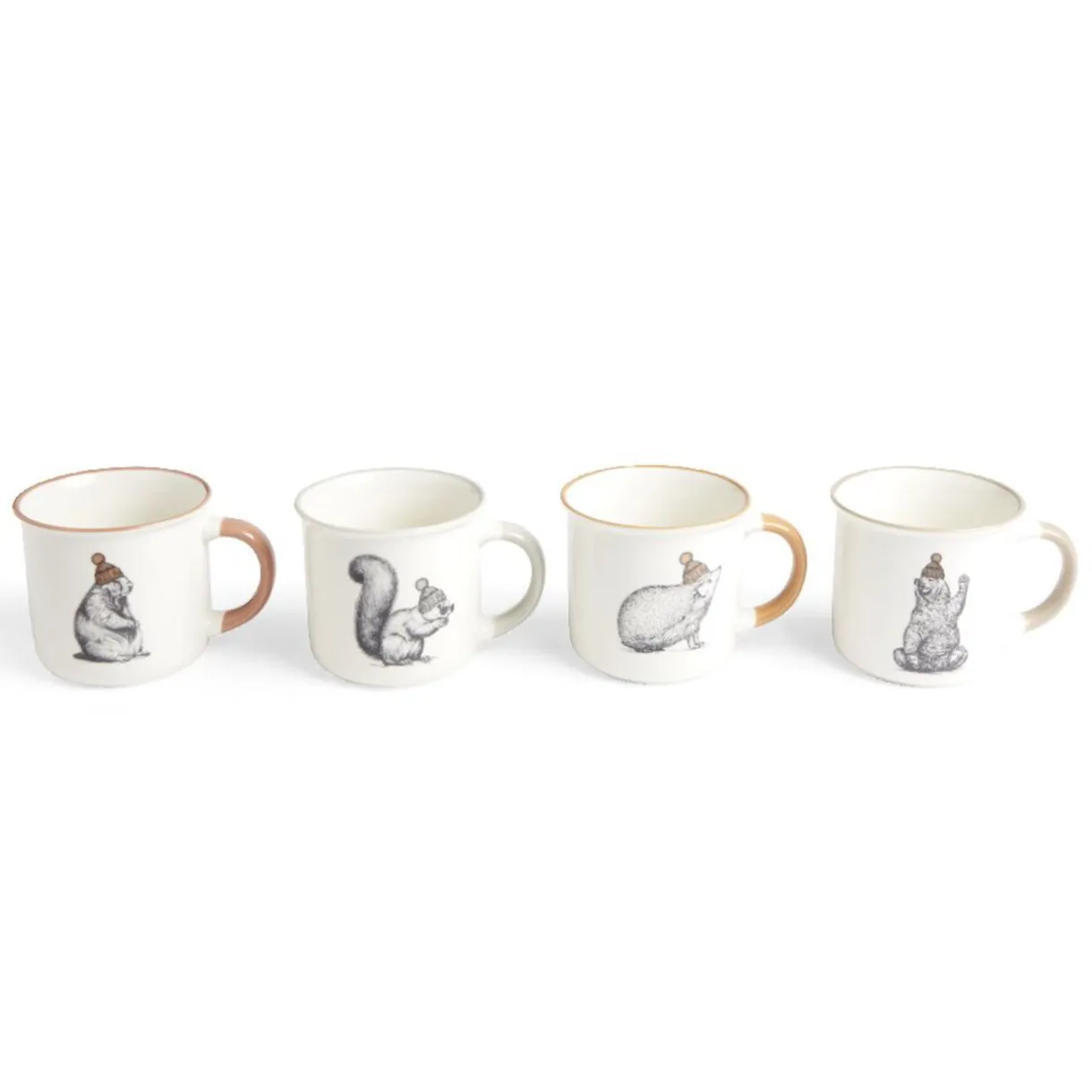 Cet ensemble de 4 mugs ornés de motifs d’animaux funs avec un bonnet sur la tête (1 écureuil, 1 ours, 1 hérisson, 1 marmotte) apportent une touche ludique à vos pauses café ou thé.