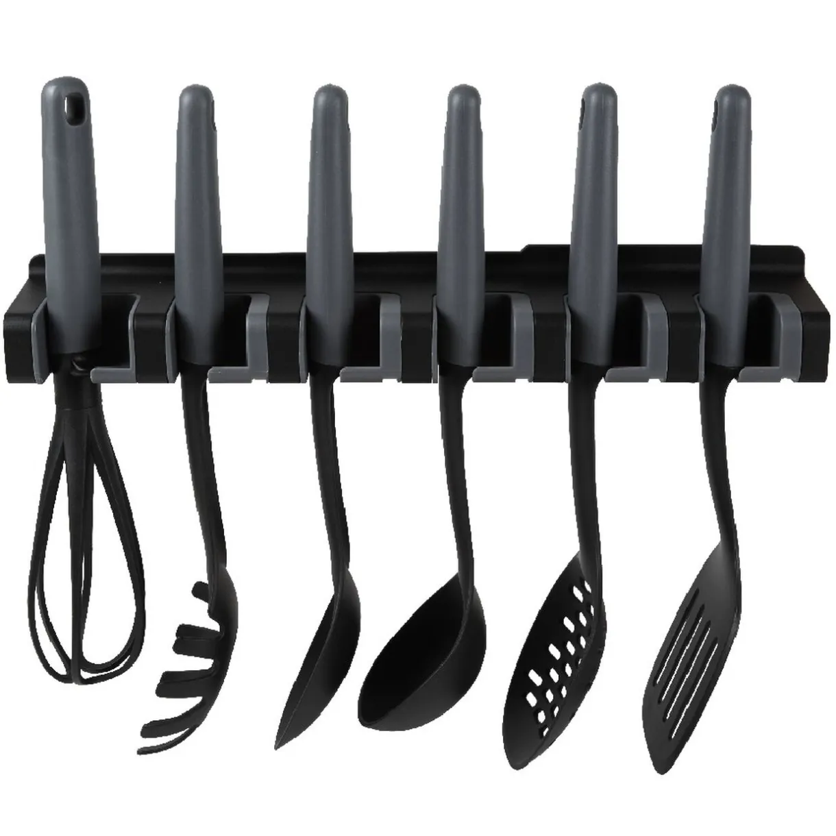 Lot de 6 ustensiles de cuisine en polyamide avec leur support à fixation murale par ventouse.