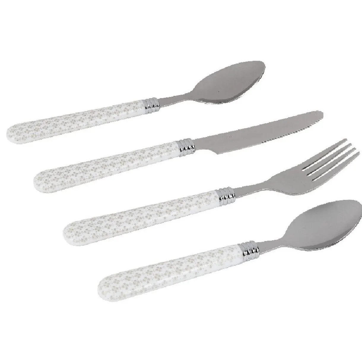 Ménagère de 16 pièces en métal gris et manche design oreige comprenant 4 fourchettes, 4 couteaux, 4 cuillères à soupe et 4 cuillères à café.