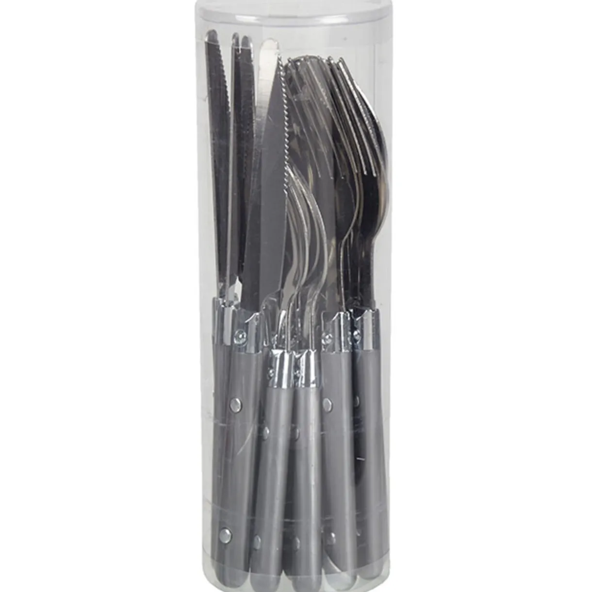 Ménagère 16 pièces gris comprenant 4 fourchettes, 4 cuillères à soupe, 4 couteaux et 4 cuillères à café, inox, manche plastique.