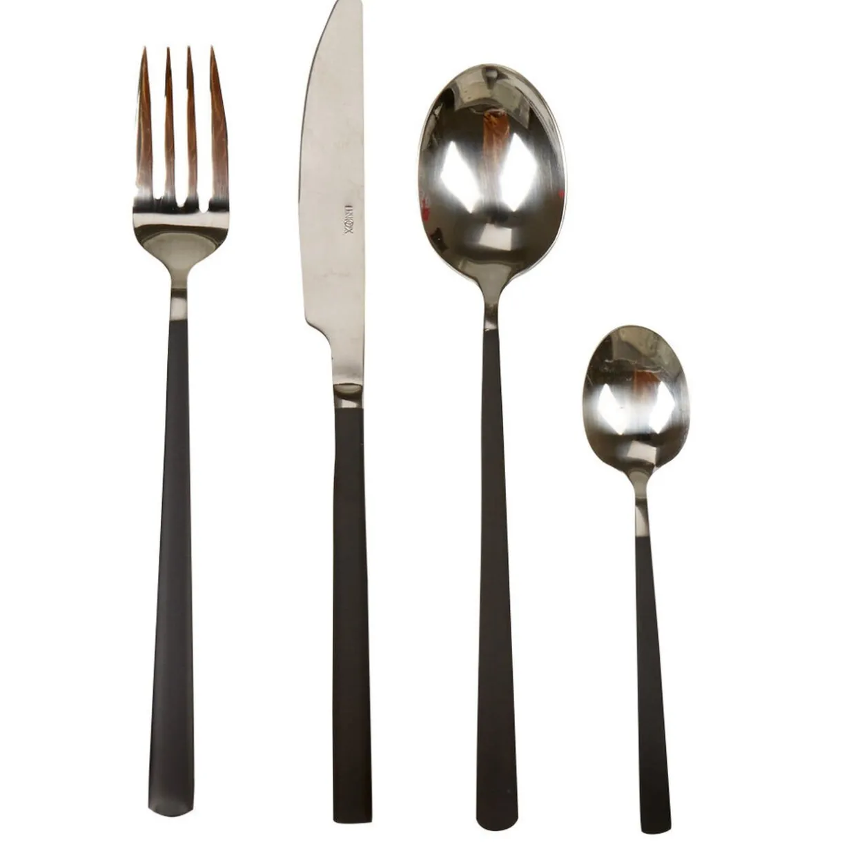 Ménagère 16 pièces moderne, inox et manche avec couverture en silicone noir.