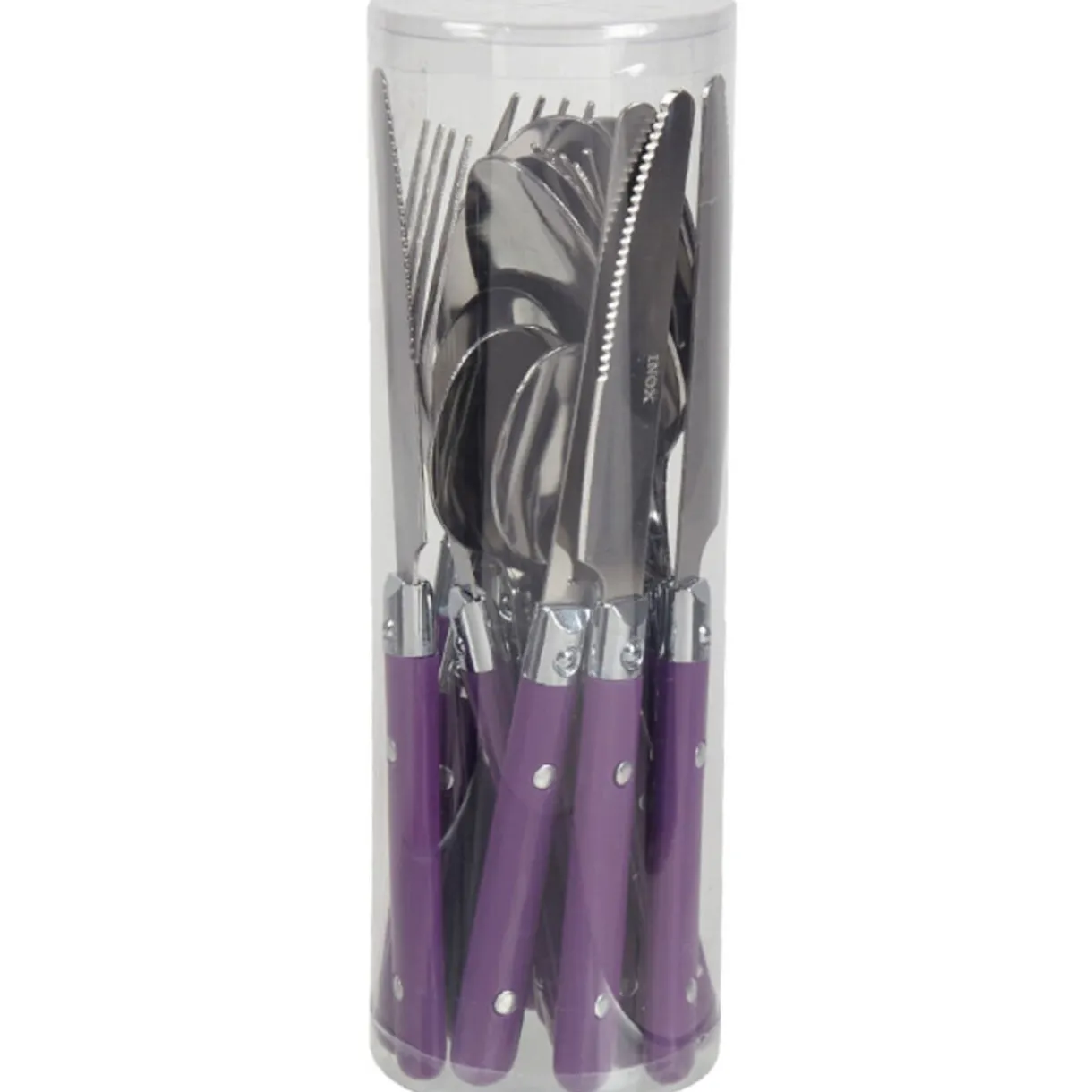 Ménagère 16 pièces violet comprenant 4 fourchettes, 4 cuillères à soupe, 4 couteaux et 4 cuillères à café, inox, manche plastique.